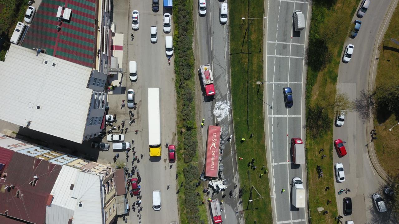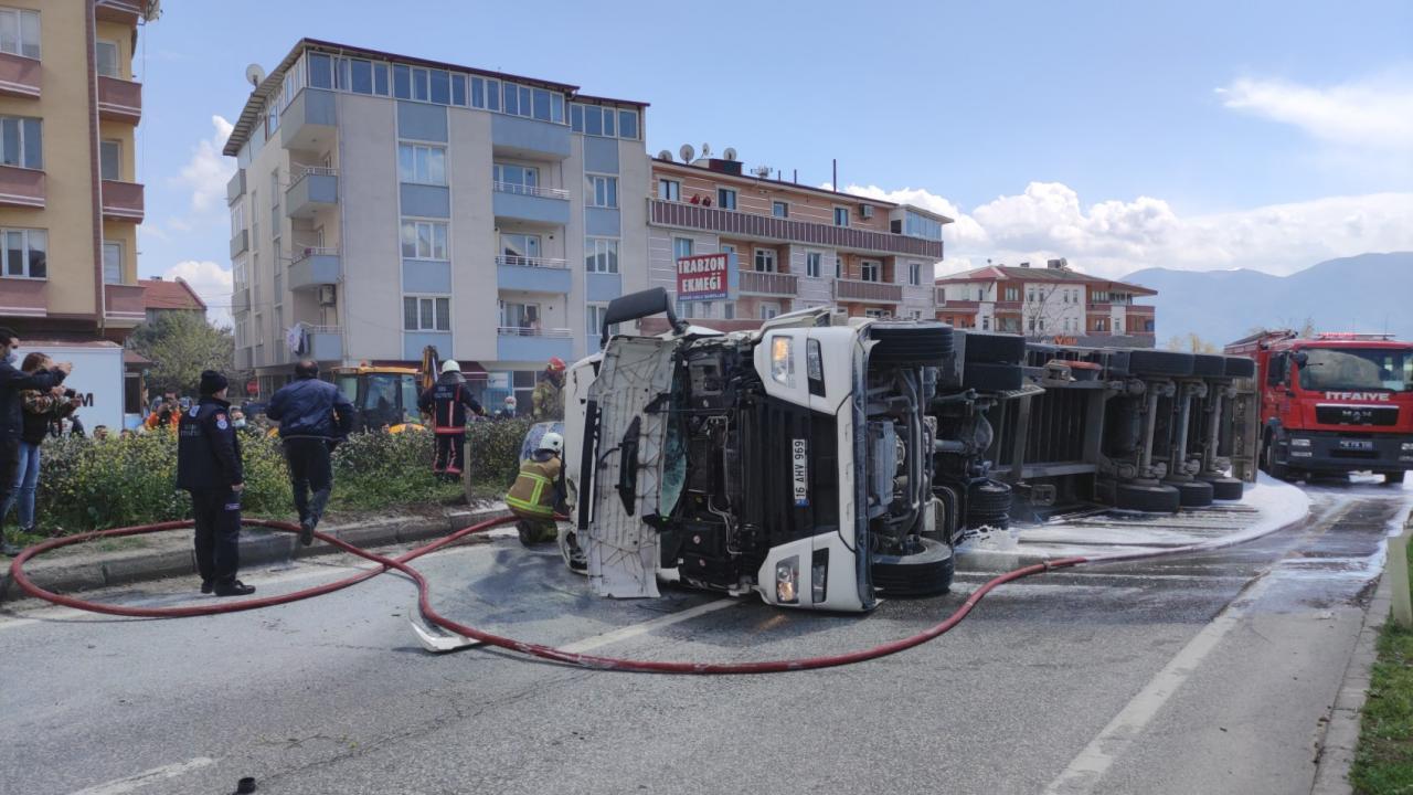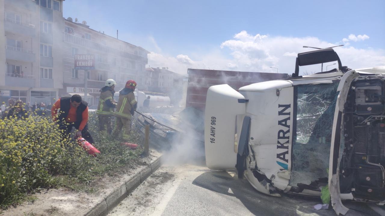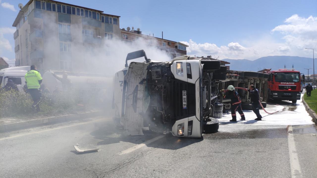 Bursa'da devrilen tır alev aldı