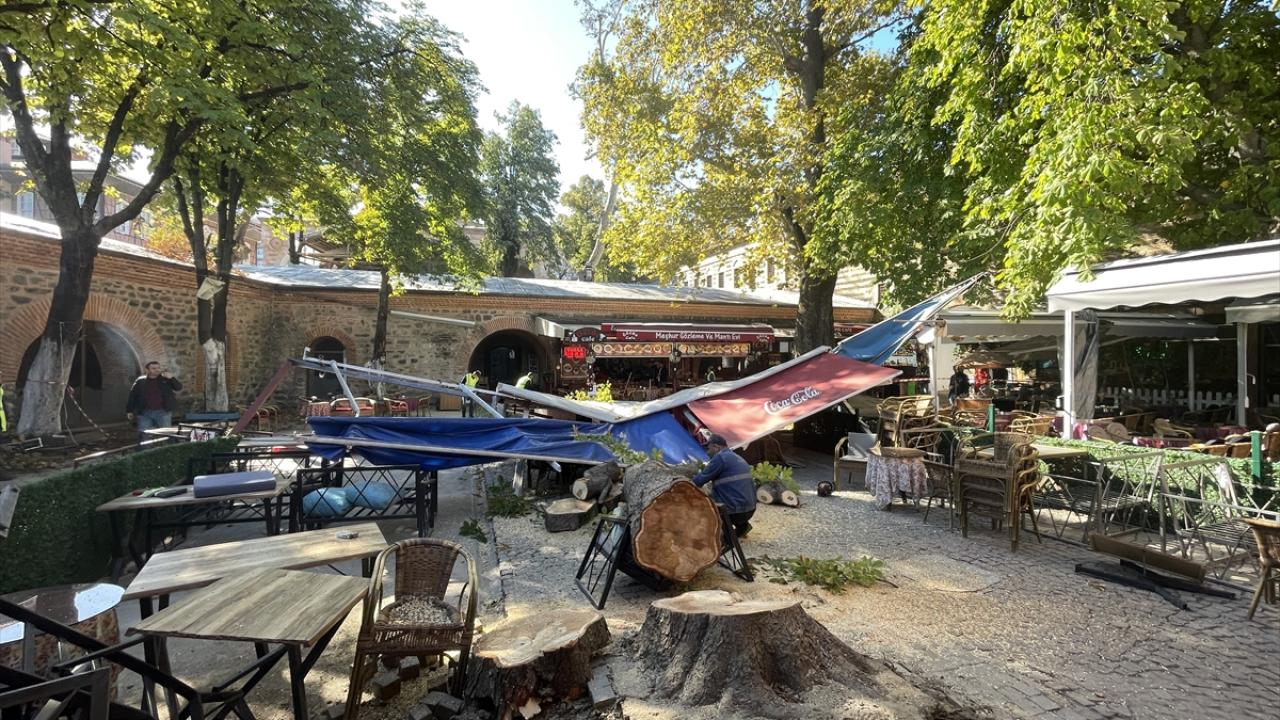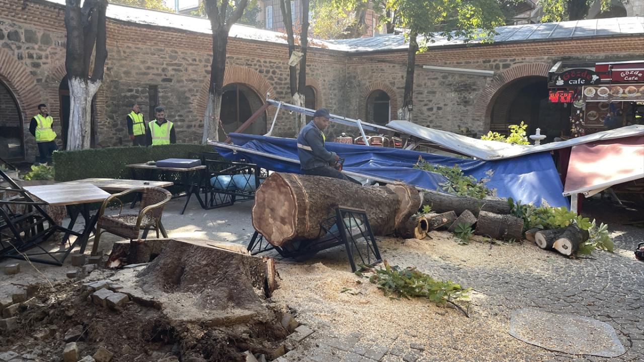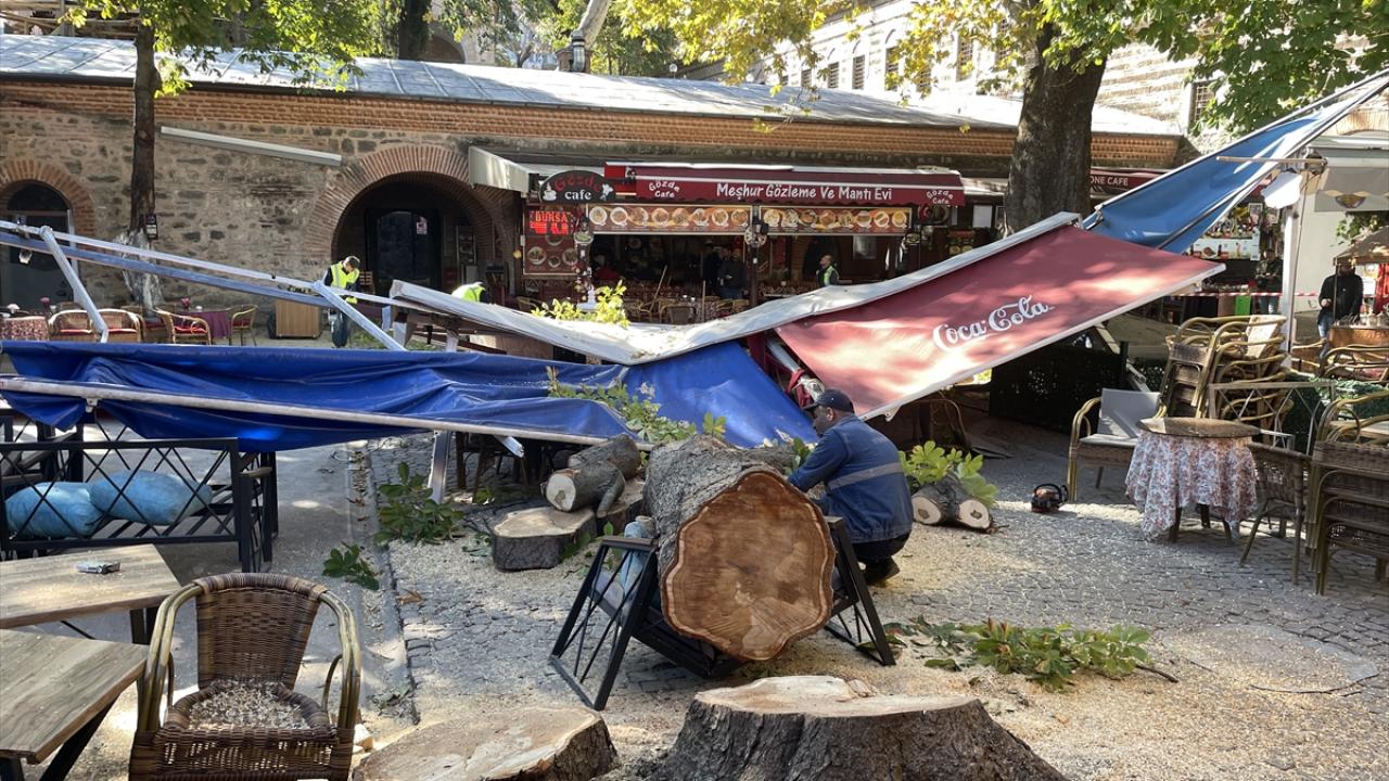 Kimsenin bulunmadığı sırada çay bahçelerinin tentelerinin üzerine devrilen ağacın kaldırılması için Büyükşehir Belediyesi ekiplerince çalışma başlatıldı.