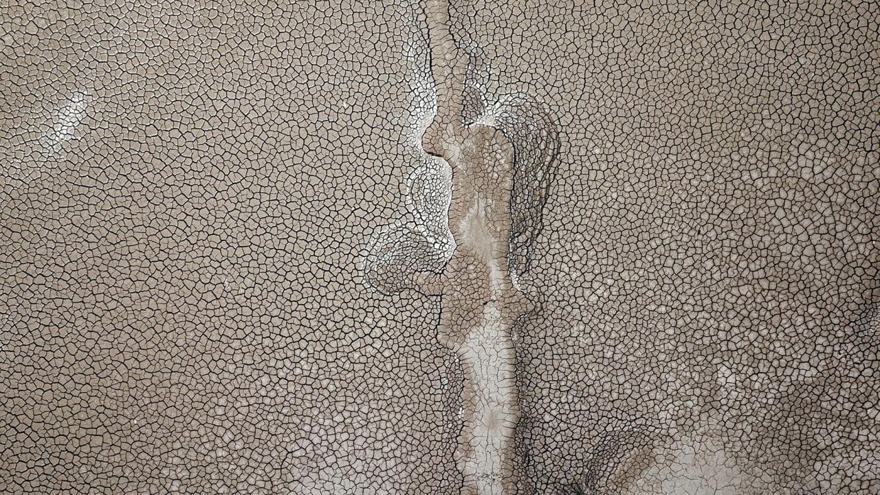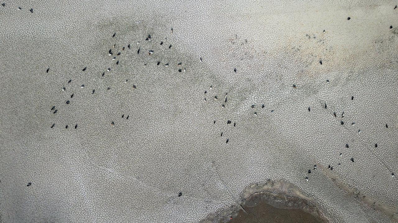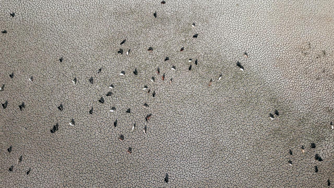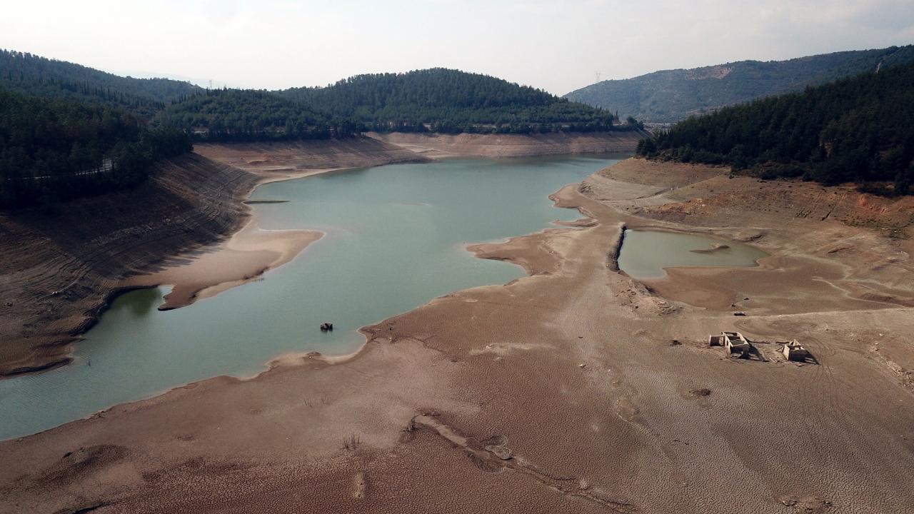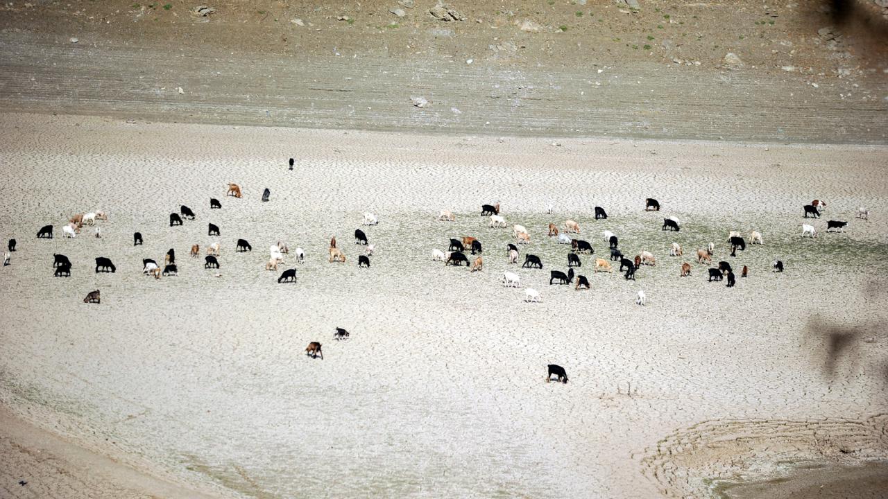 Kuruyan noktalarında derin çatlakların oluştuğu, koyun ve keçilerin otladığı baraj, dron ile havadan görüntülendi.
