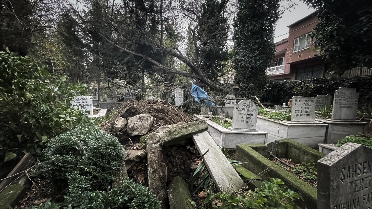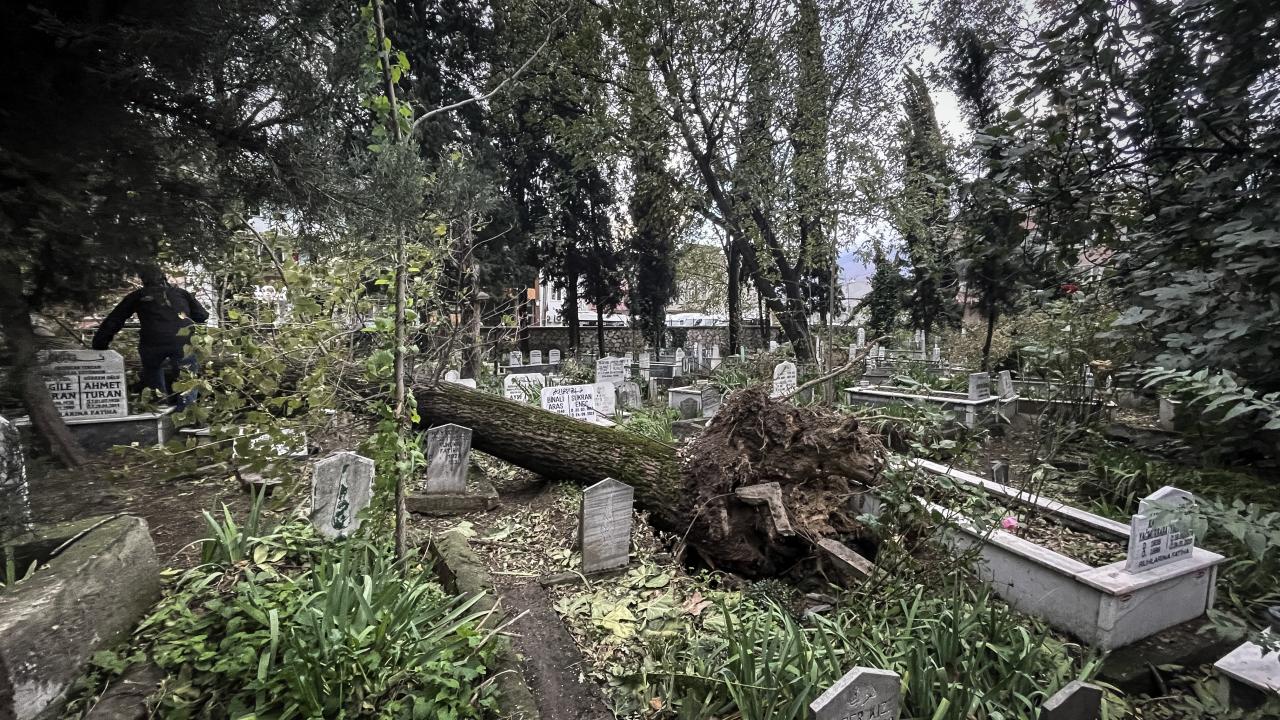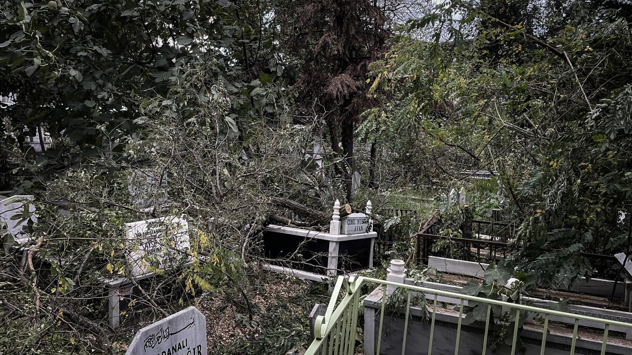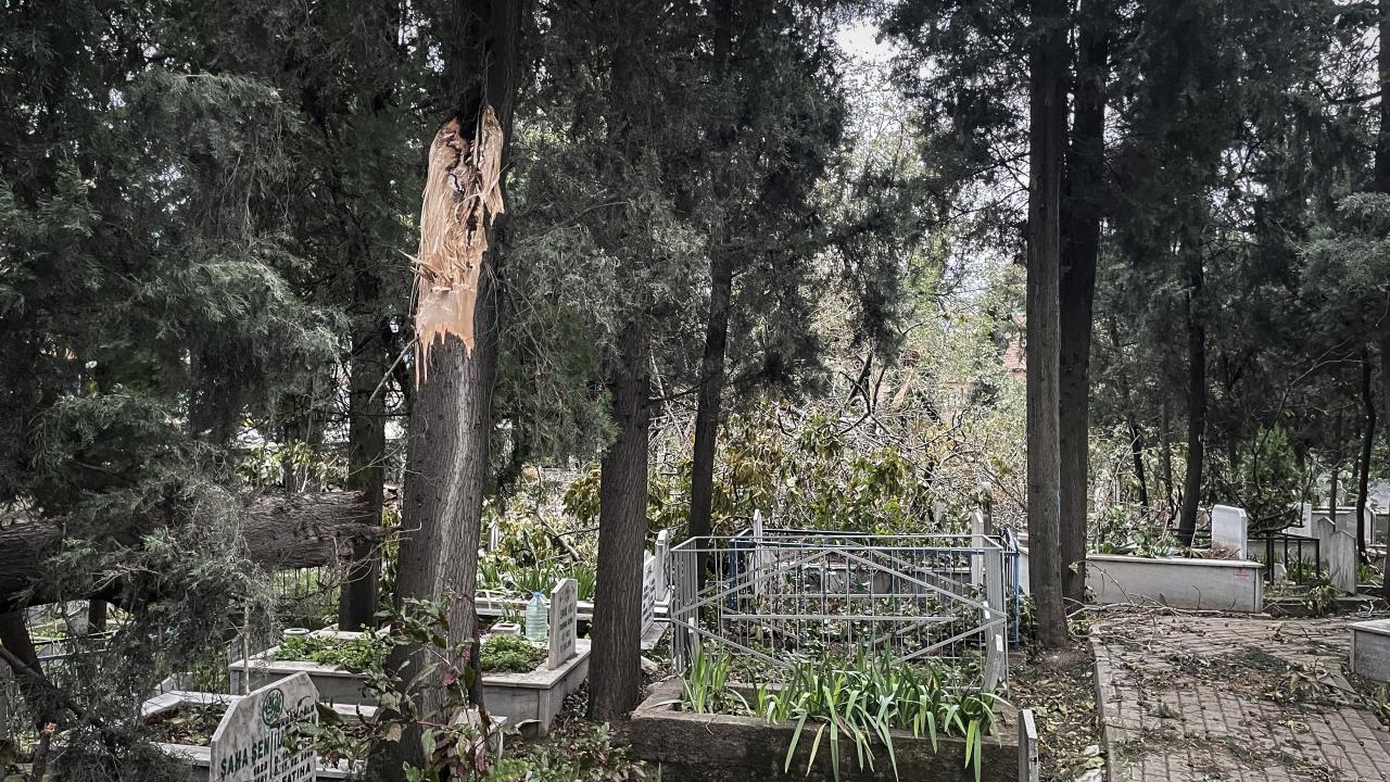 Bursa'nın Osmangazi ilçesinde kuvvetli lodosun etkisiyle devrilen ağaçlar Küçükbalıklı Mezarlığındaki mezarları tahrip etti.