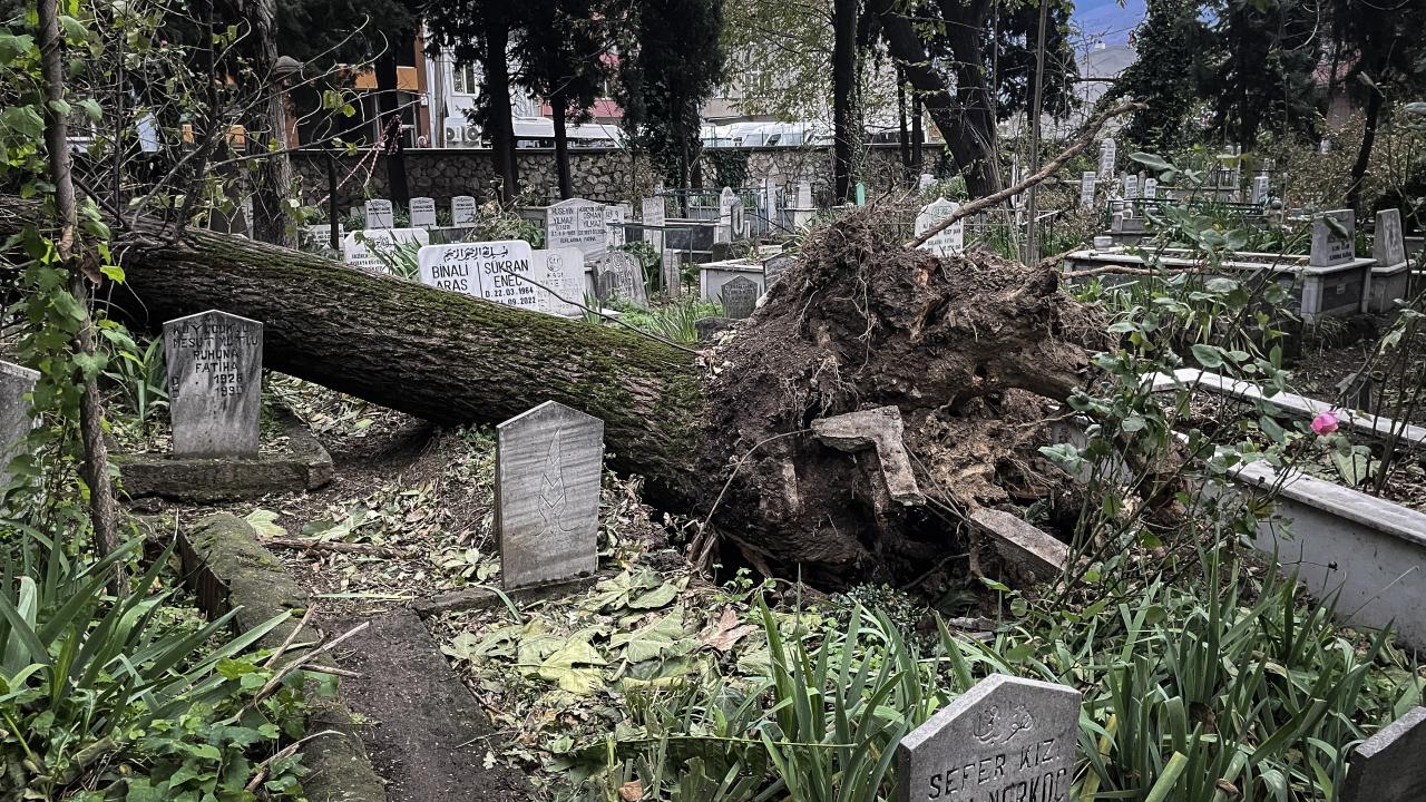 Bursa'da kuvvetli lodosta devrilen ağaçlar mezarlara zarar verdi