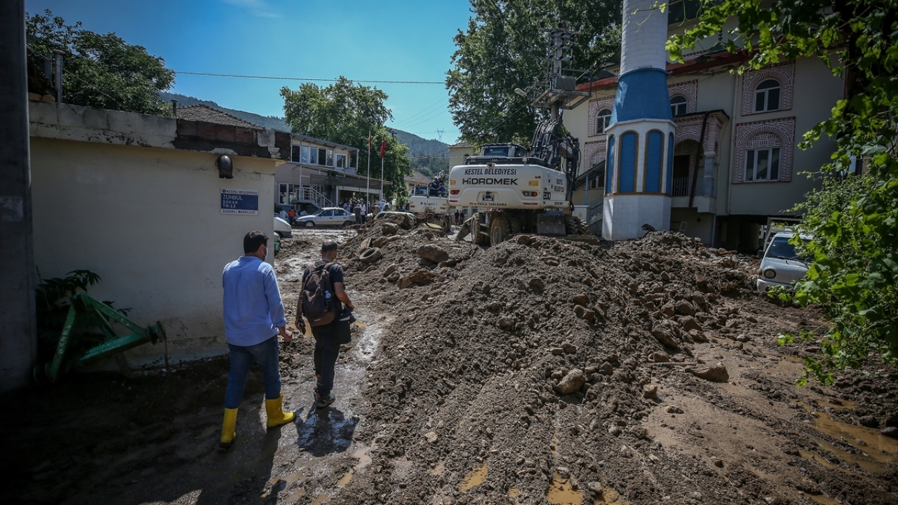 Bursa'nın Kestel ilçesinde meydana gelen sel nedeniyle bir kişinin hayatını kaybettiği Dudaklı Mahallesi'nde hasar tespit ve temizleme çalışmaları devam ediyor.