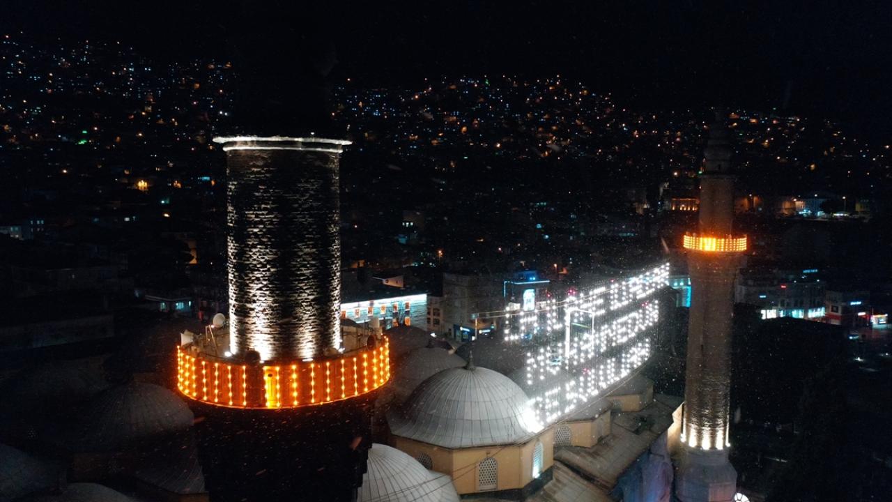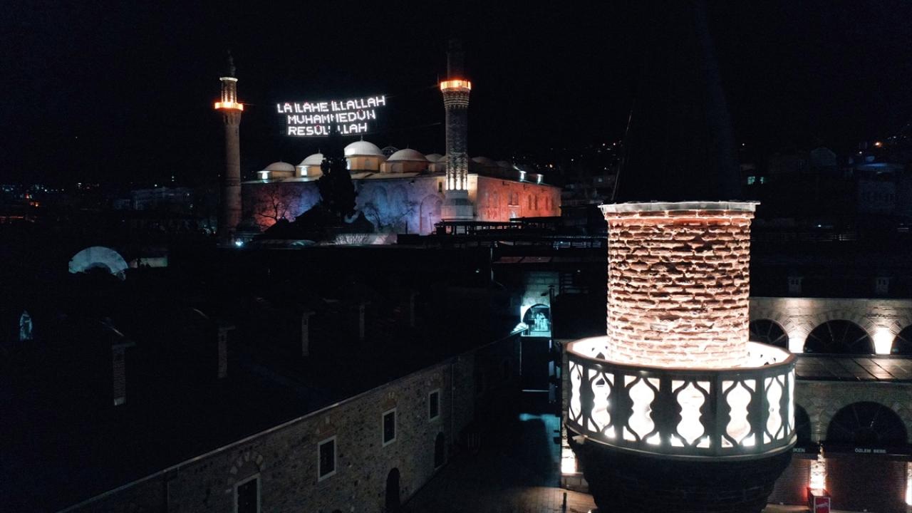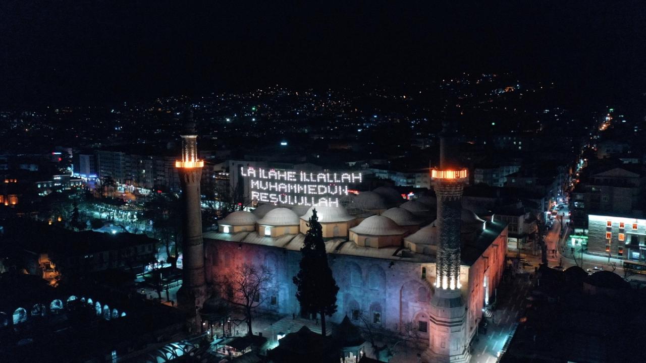 Ulu Cami`nin 70 metre mesafesindeki iki minareye asılan mahya, ramazanın ikinci yarısında Kelime-i Tevhid mahyasıyla değiştirildi.