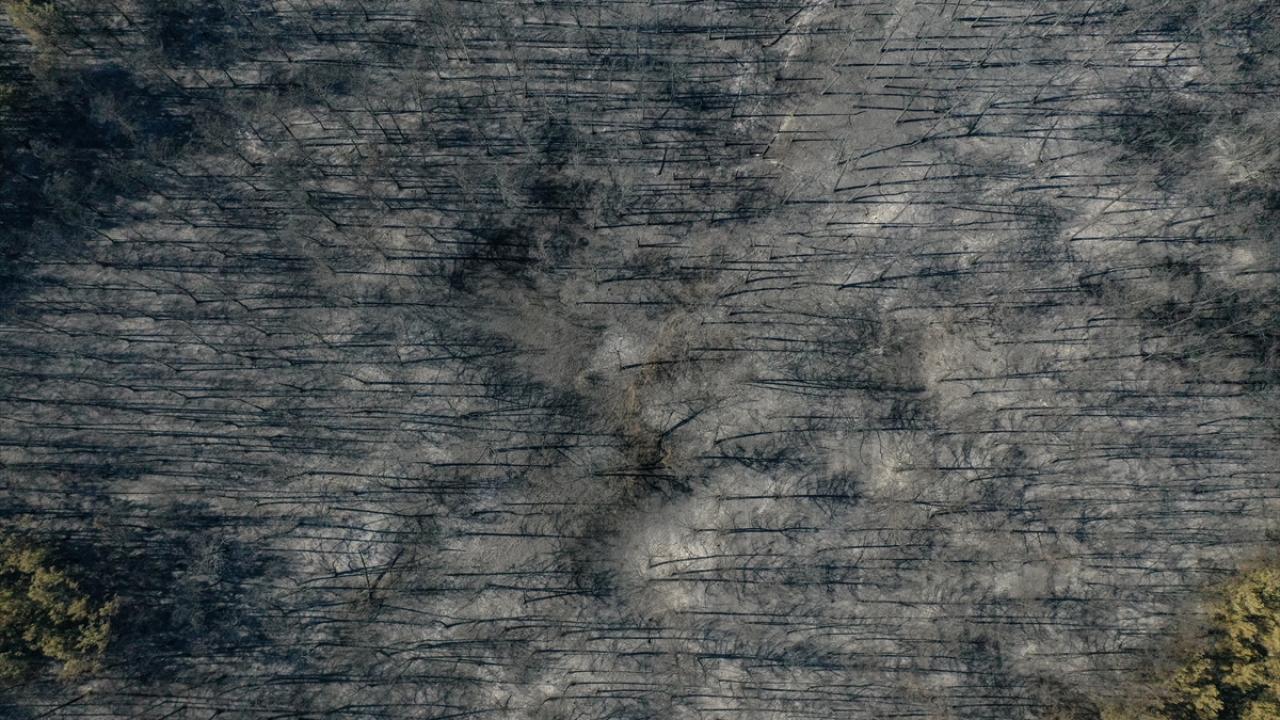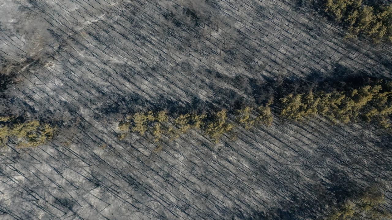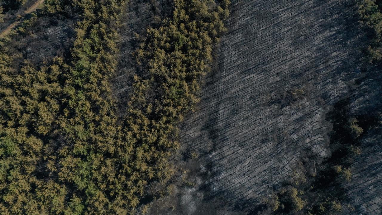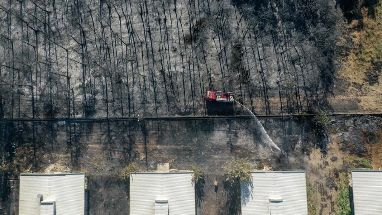 Soğutma çalışması ve hasar tespitinin sürdüğü kampüste yanan ormanlık alan, dronla görüntülendi.