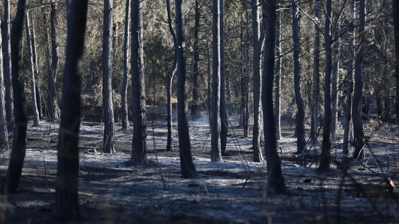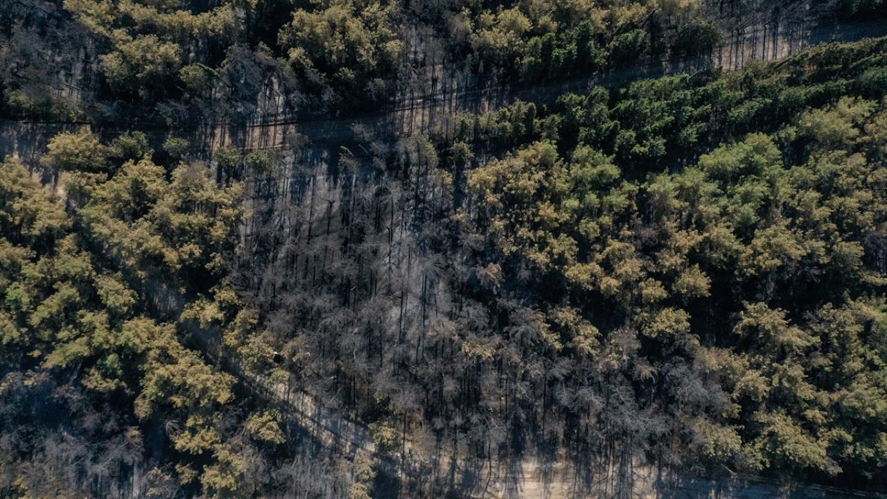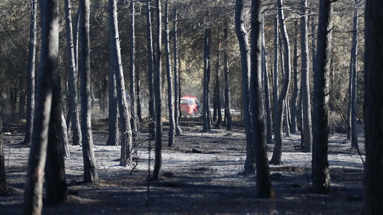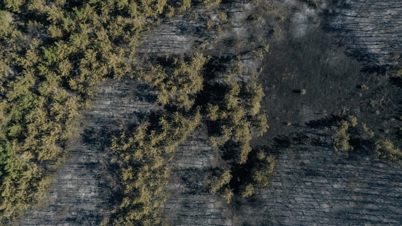 Soğutma çalışması ve hasar tespitinin sürdüğü kampüste yanan ormanlık alan, dronla görüntülendi.