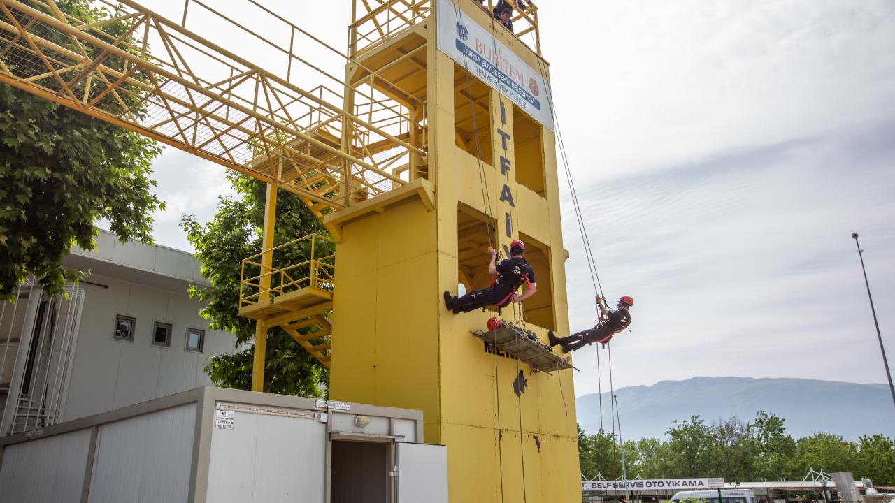 Osmangazi ilçesi Küçükbalıklı Mahallesi`ndeki İtfaiye Eğitim Merkezi`nde yangına müdahale, arama kurtarma gibi konularda uygulama yapılıyor.