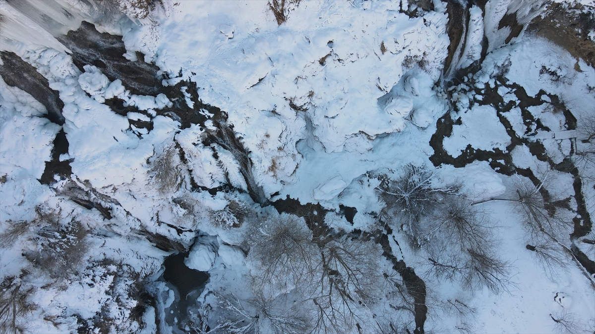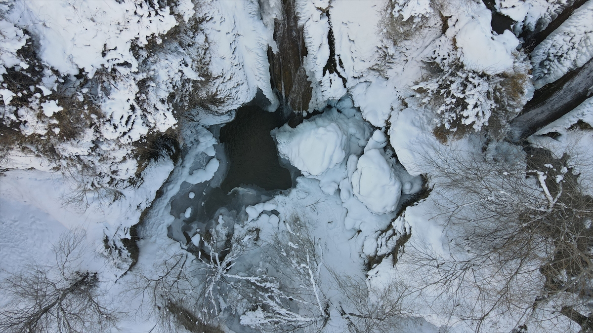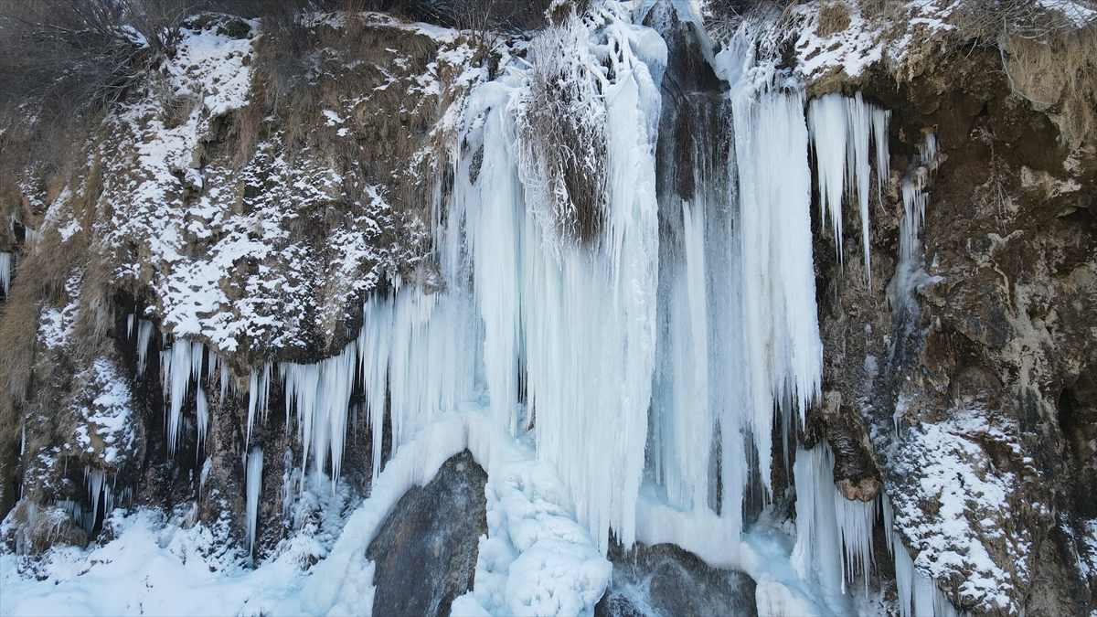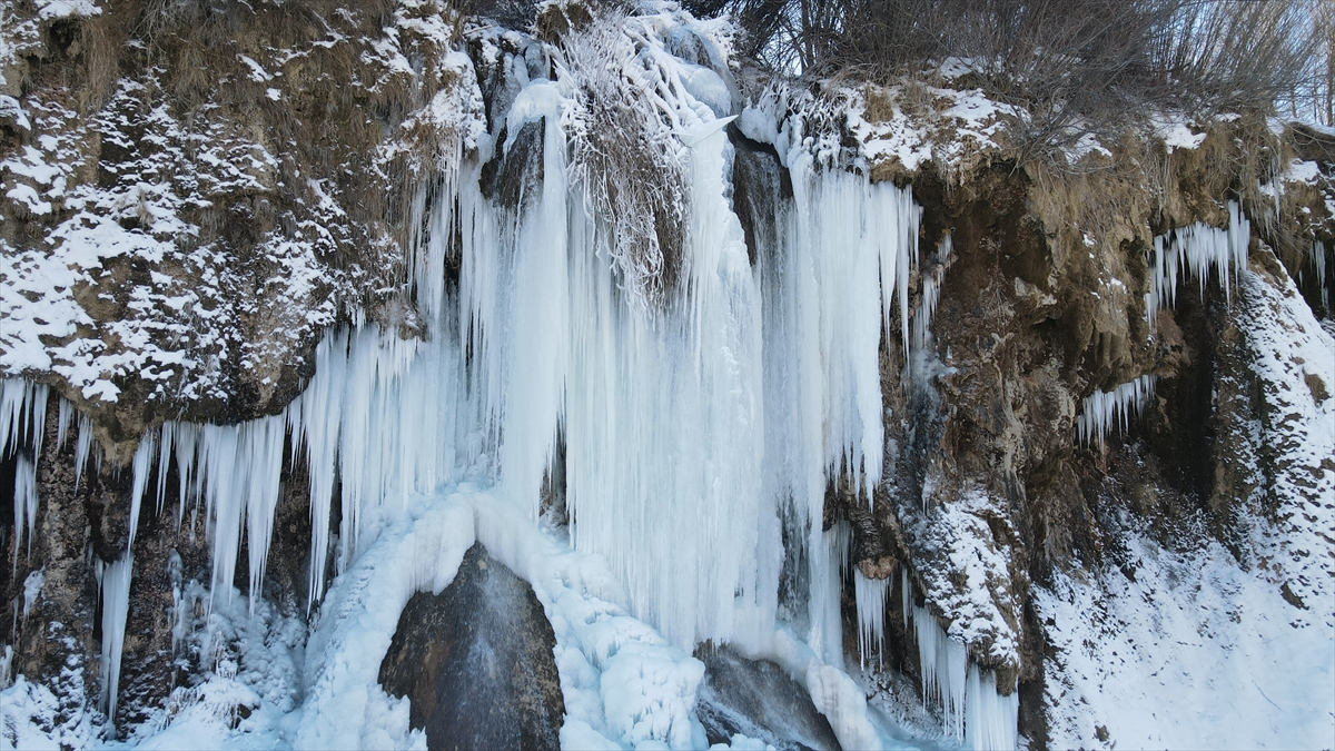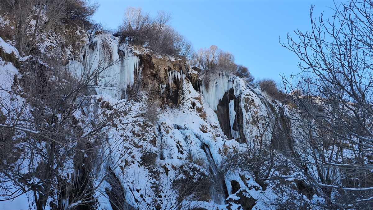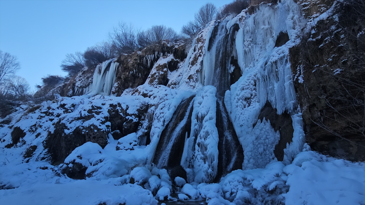 Uzun buz sarkıtlarının oluştuğu şelale, ziyaretçilerini kış güzelliğiyle ağırlıyor.