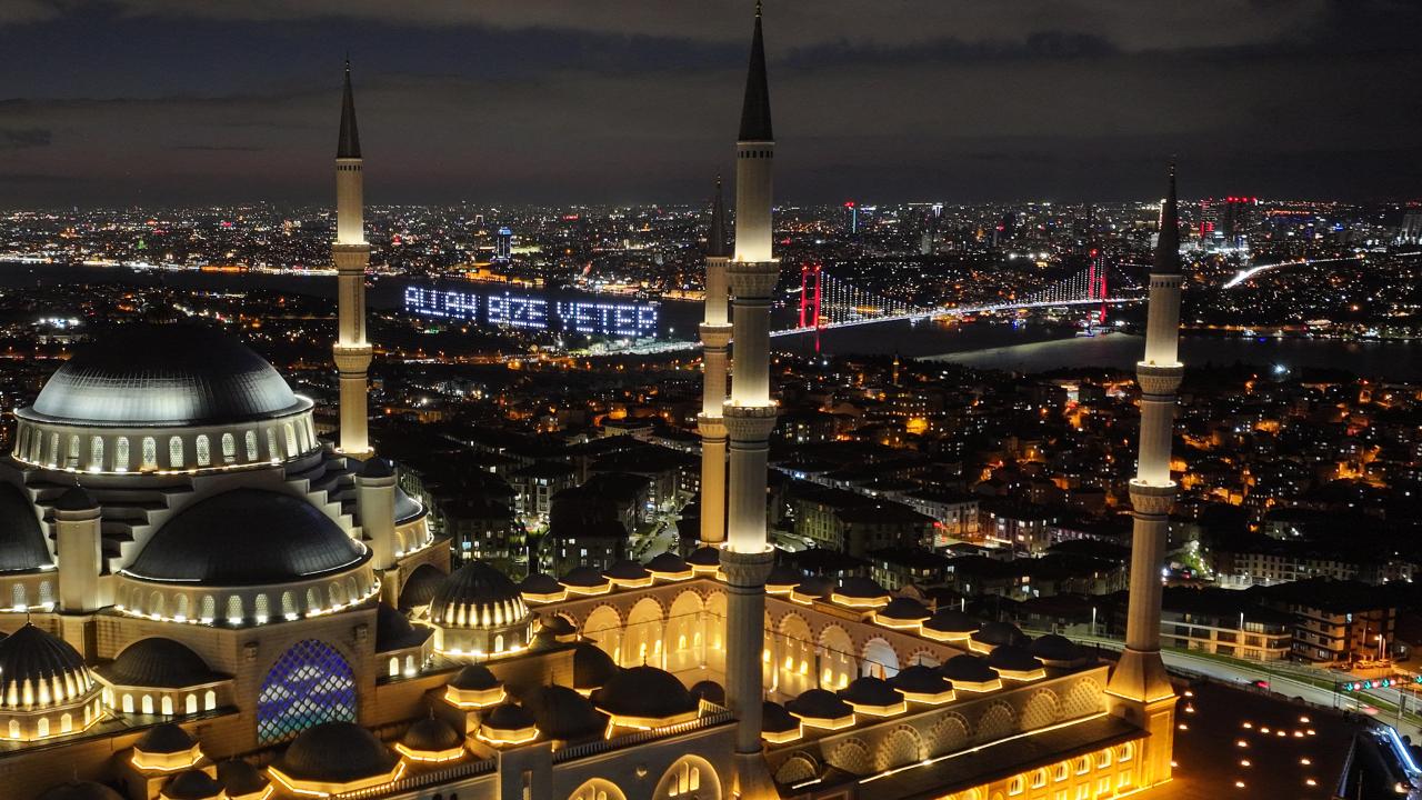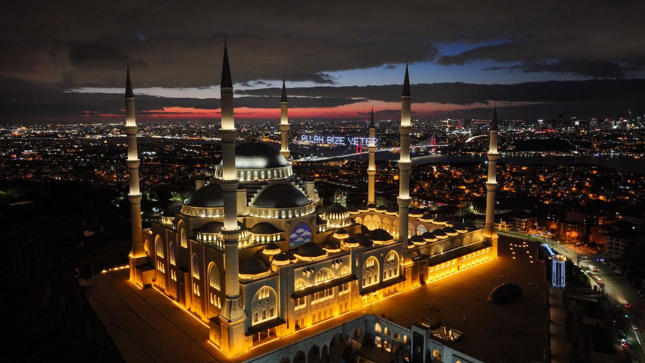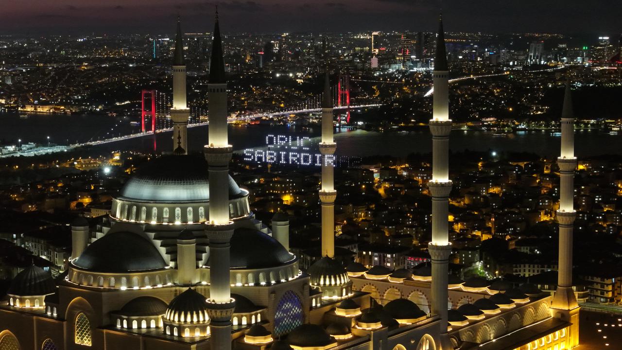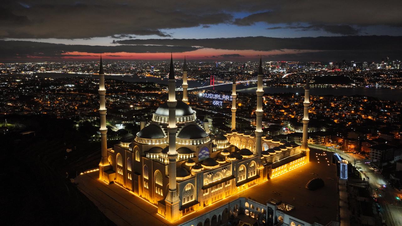 İstanbul’da ramazan ayı dolayısıyla minareleri arasına ''Kusurları Ört'' yazısı yansıtılan Büyük Çamlıca Camii havadan görüntülendi.