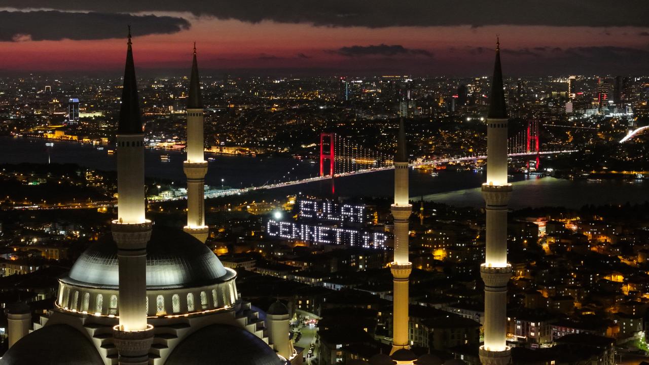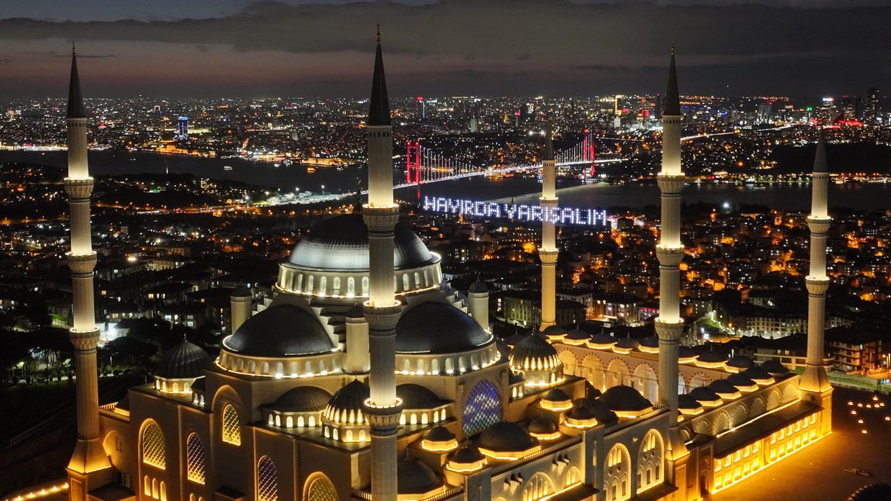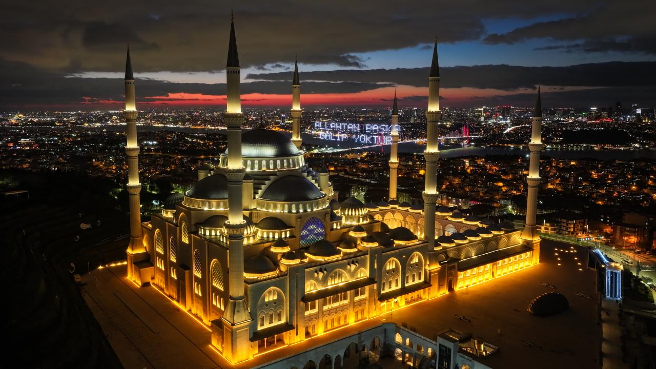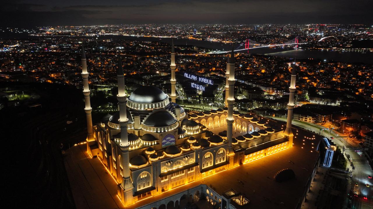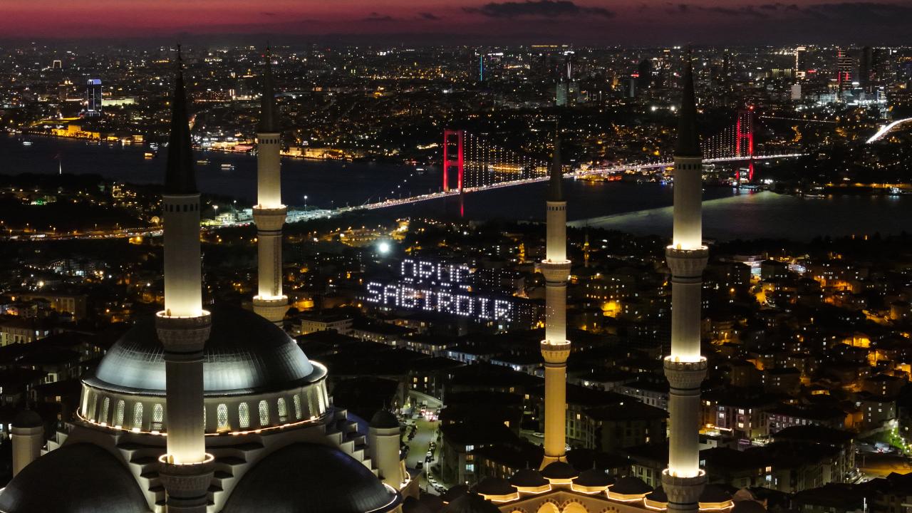 İstanbul’da ramazan ayı dolayısıyla minareleri arasına ''Kusurları Ört'' yazısı yansıtılan Büyük Çamlıca Camii havadan görüntülendi.