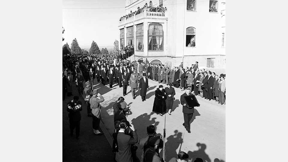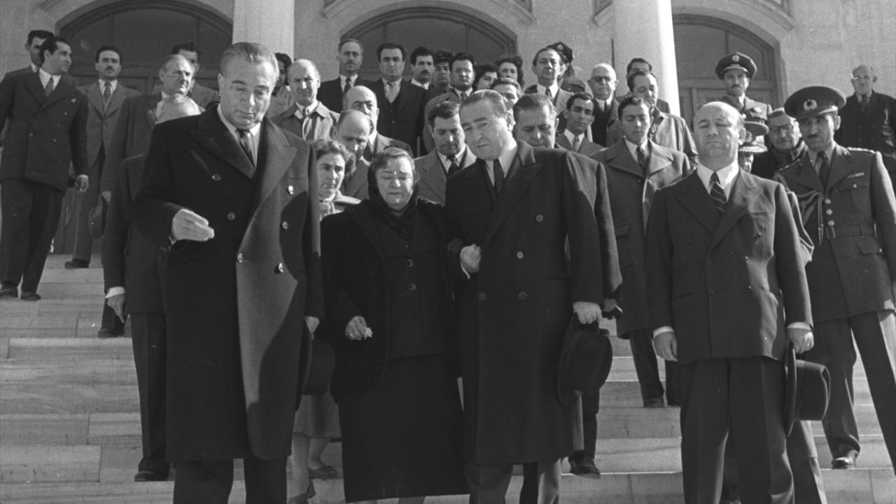 Mustafa Kemal Atatürk`ün cenazesinin Anıtkabir`e nakli töreninde, Atatürk`ün İstiklal madalyasının taşıyan bir amiral (sağda), Atatürk`ün kız kardeşi Makbule Atadan (ortada sapkalı bayan), Cumhurbaşkanı Celal Bayar (3. sırada silindir sapkalı) ve diğer resmi zevat Türkocağı önünden geçiyor. (Arşiv)