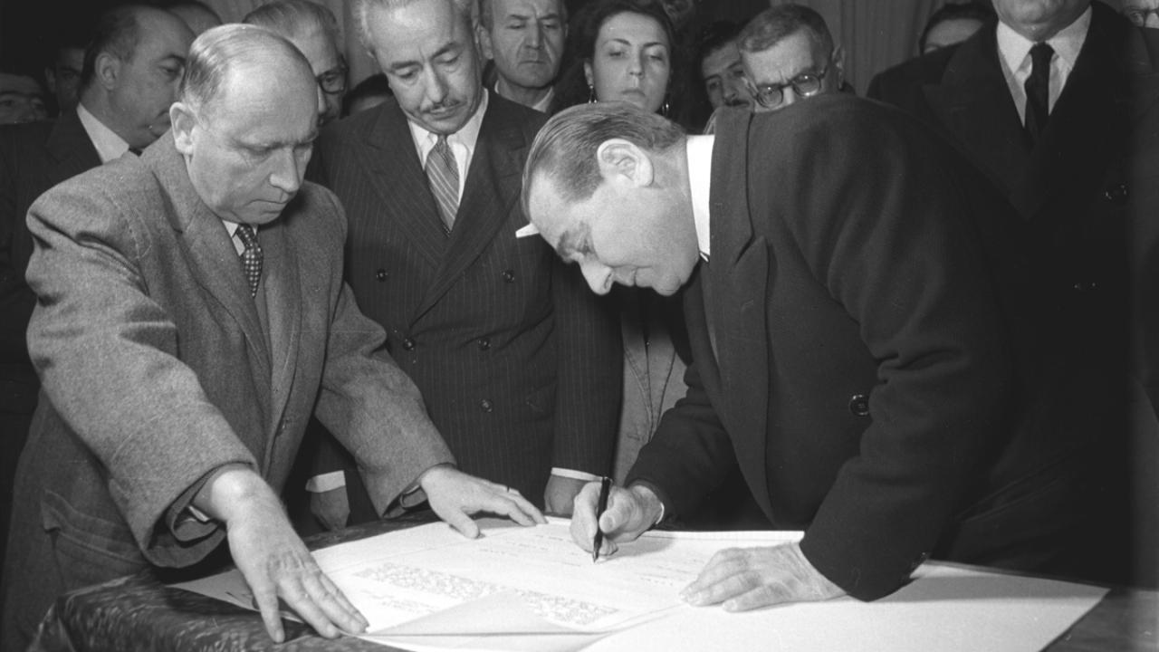 Cumhurbaşkanı Celal Bayar (sağda) bir konuşma yaptı. (Arşiv)