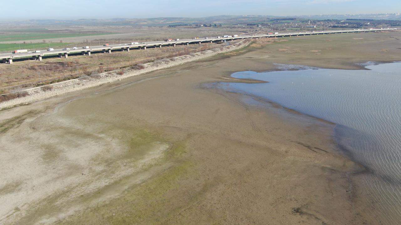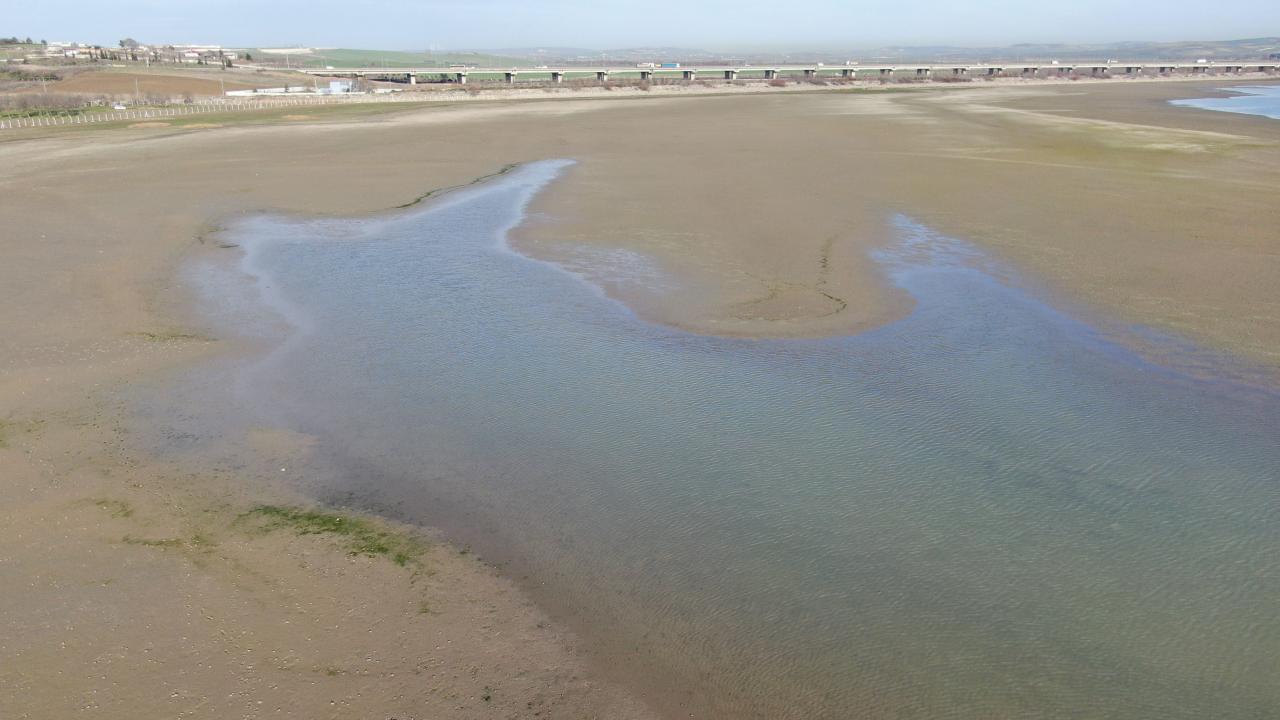 Baraj gölünde eskiden suyla dolu bazı alanlar adeta çöle döndü.