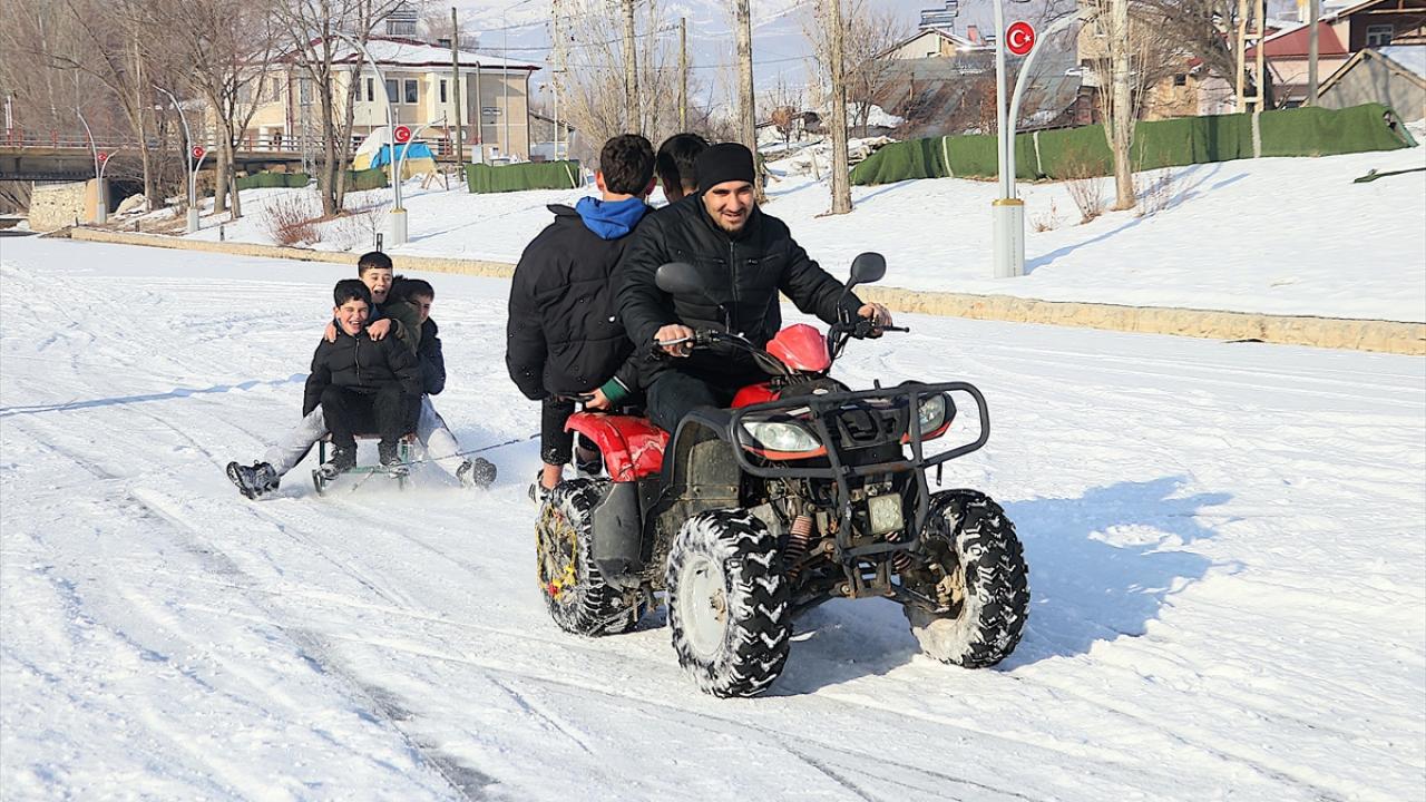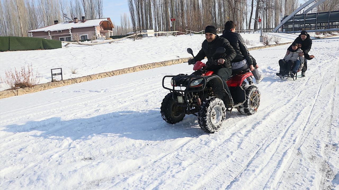 Belde sakinleri, yüzeyi yarım metrelik buzla kaplanan nehirde kızaklarıyla kaydı, bazıları da arkasına kızak bağlanan ATV ile nehir üzerinde tur attı.