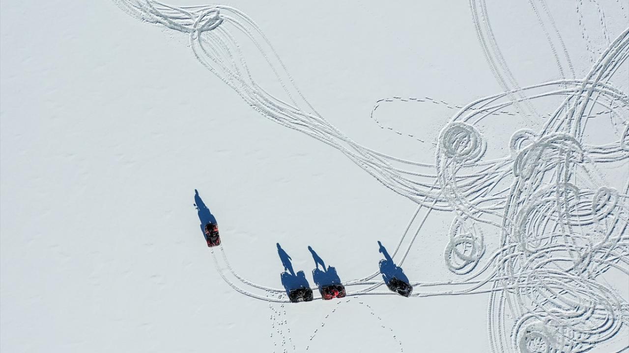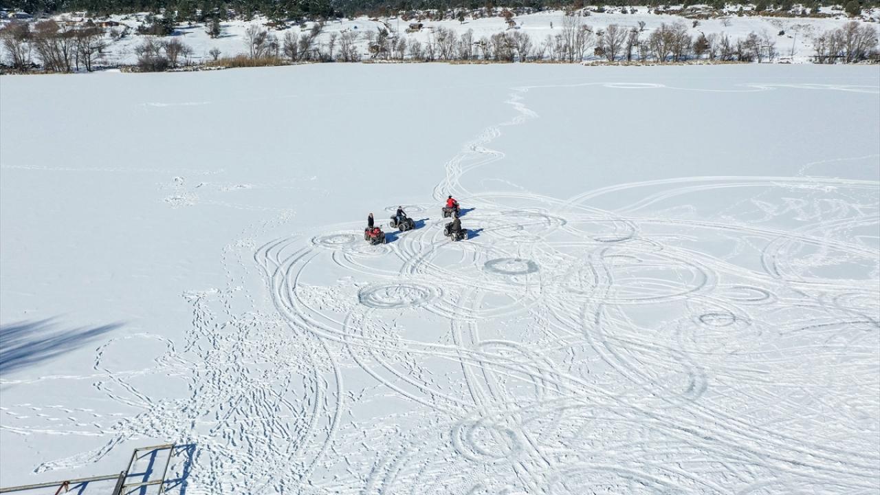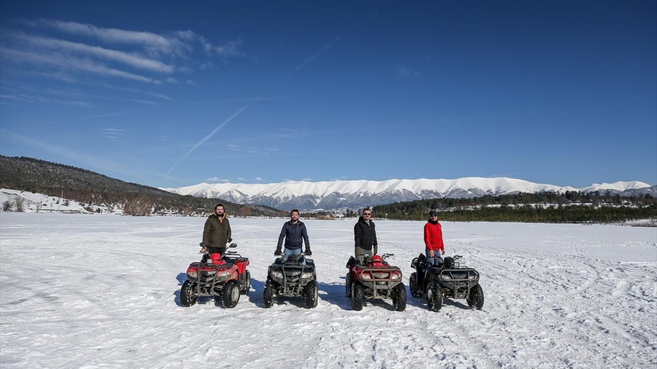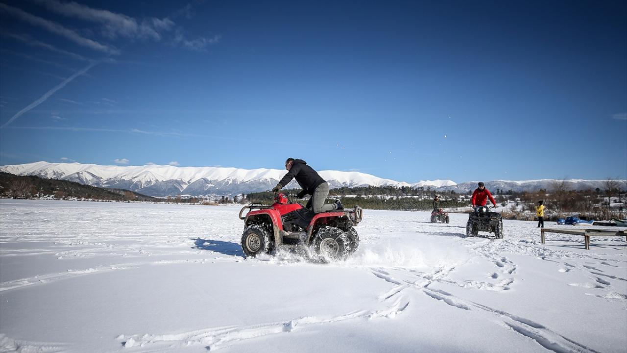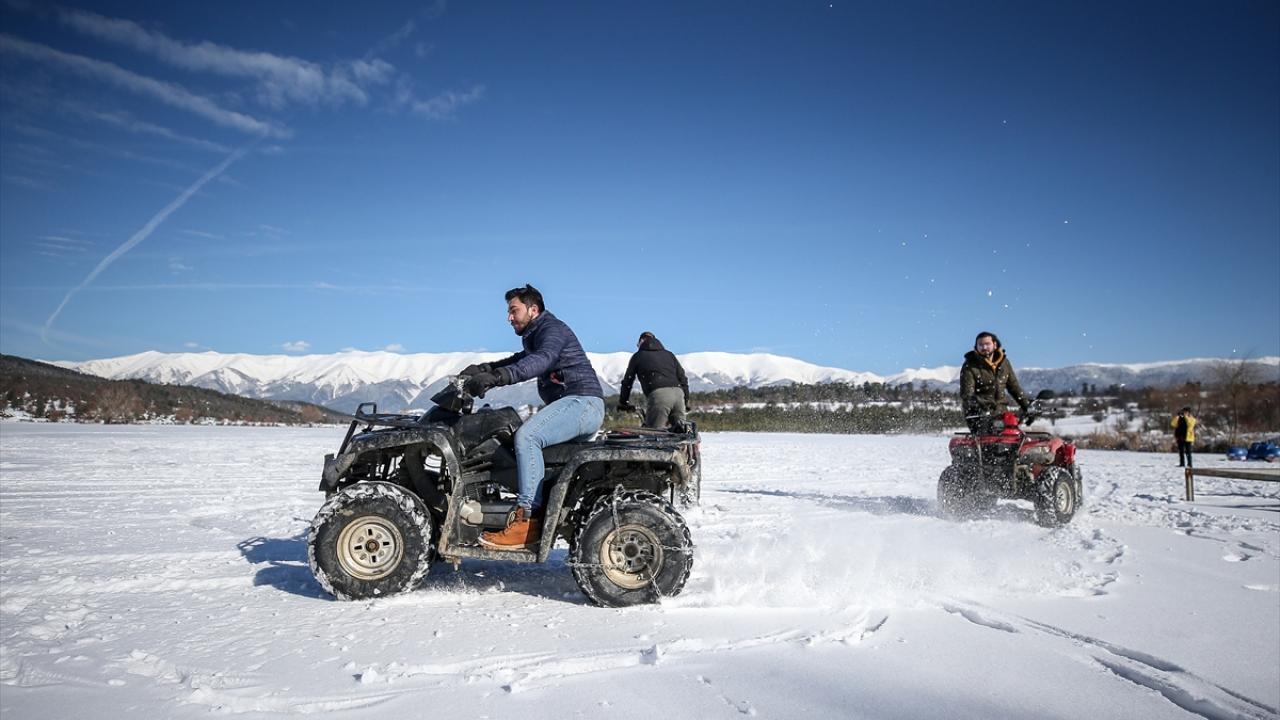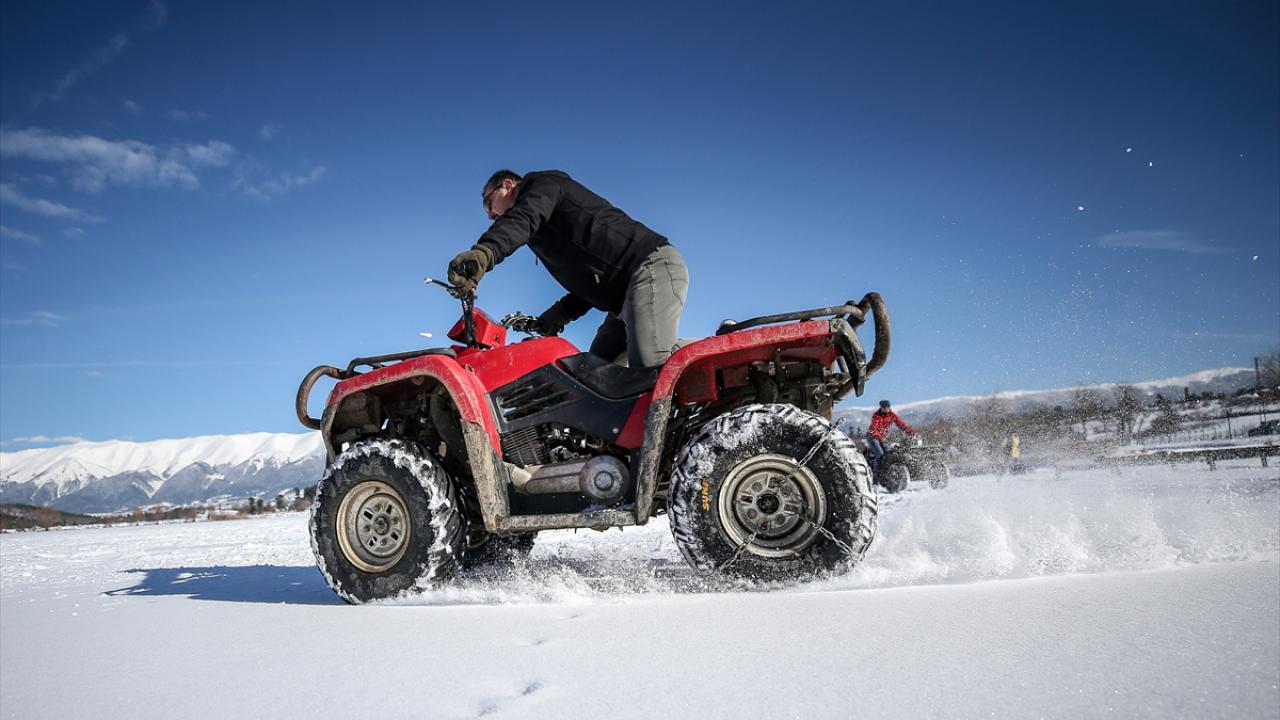 Hava sıcaklığının zaman zaman sıfırın altında 20 dereceye düştüğü bölgeyi ziyaret edenler, yüzeyi buz tutan göletin üstünde ATV safari yapıyor.