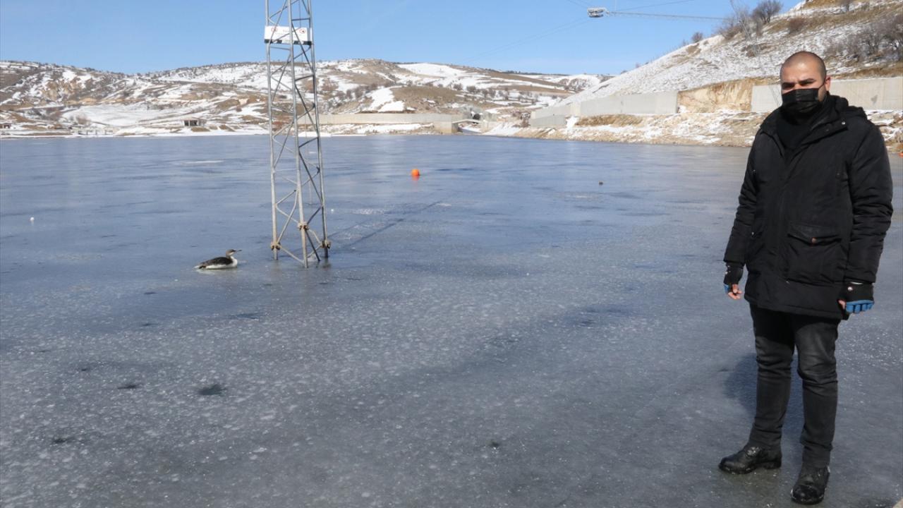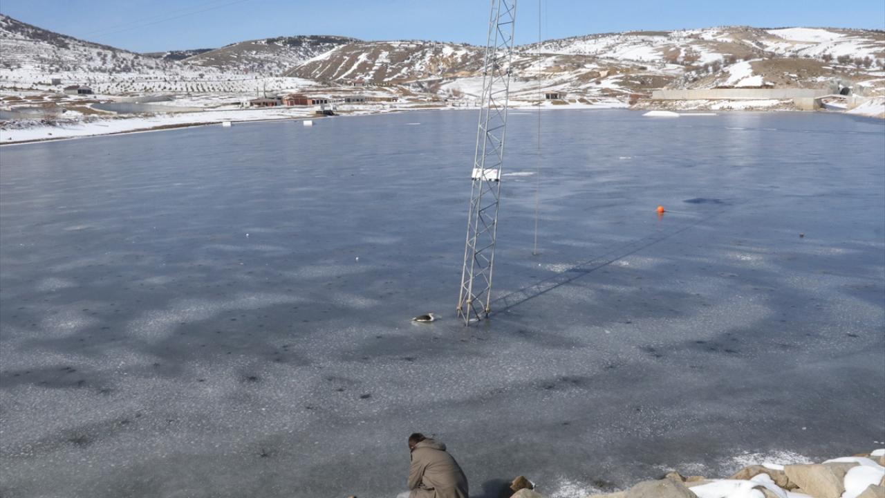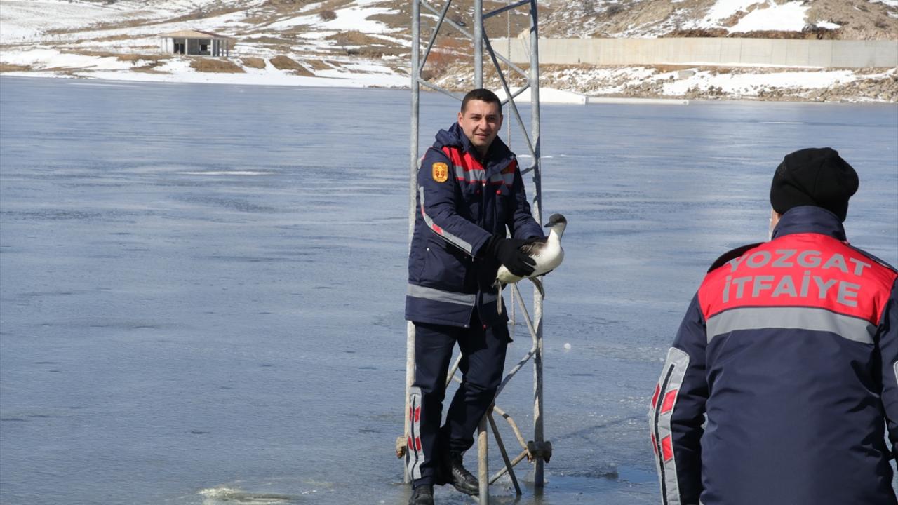 Kurumun yönlendirmesiyle bölgeye gelen itfaiye ekipleri, buzla kaplı gölet yüzeyinde yürüyerek dalgıç kuşuna ulaştı.