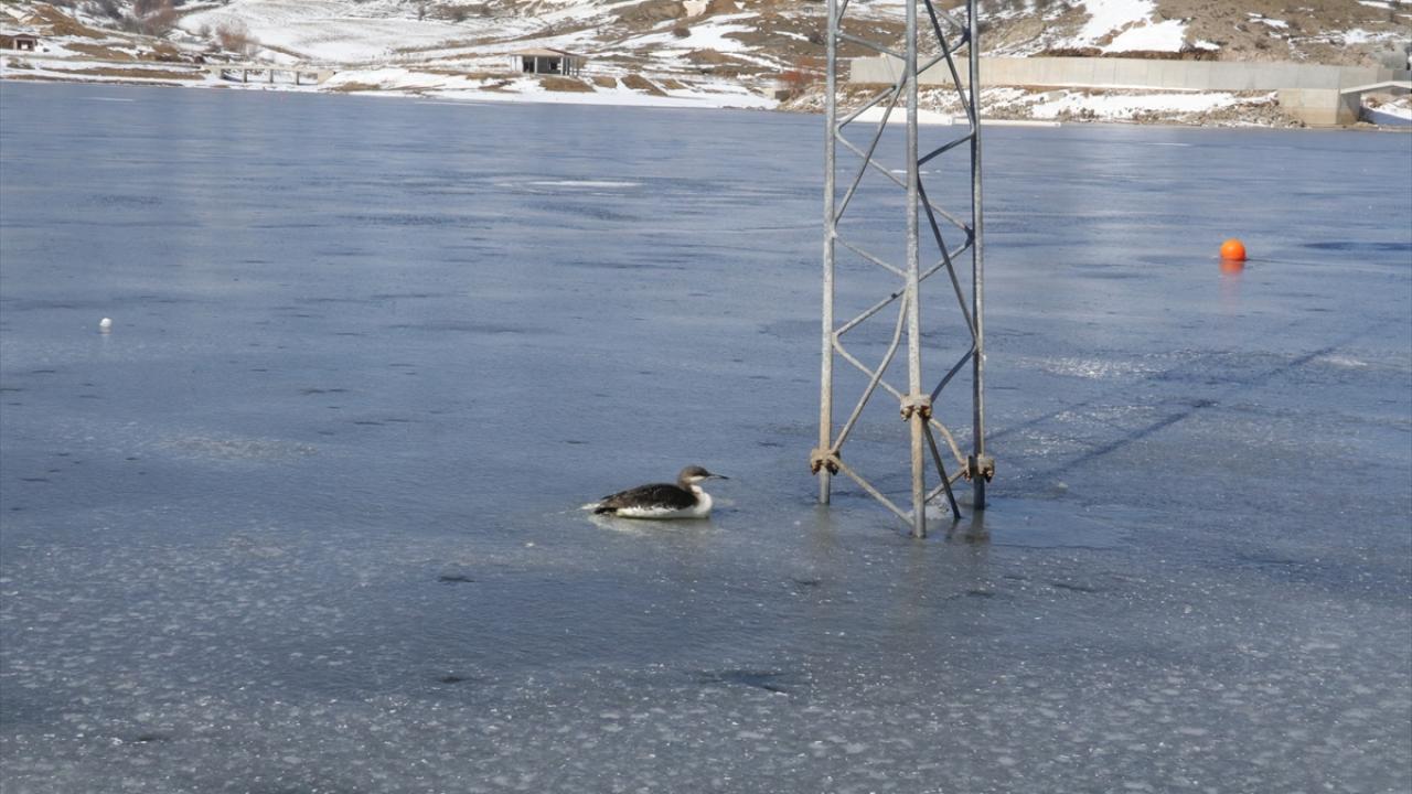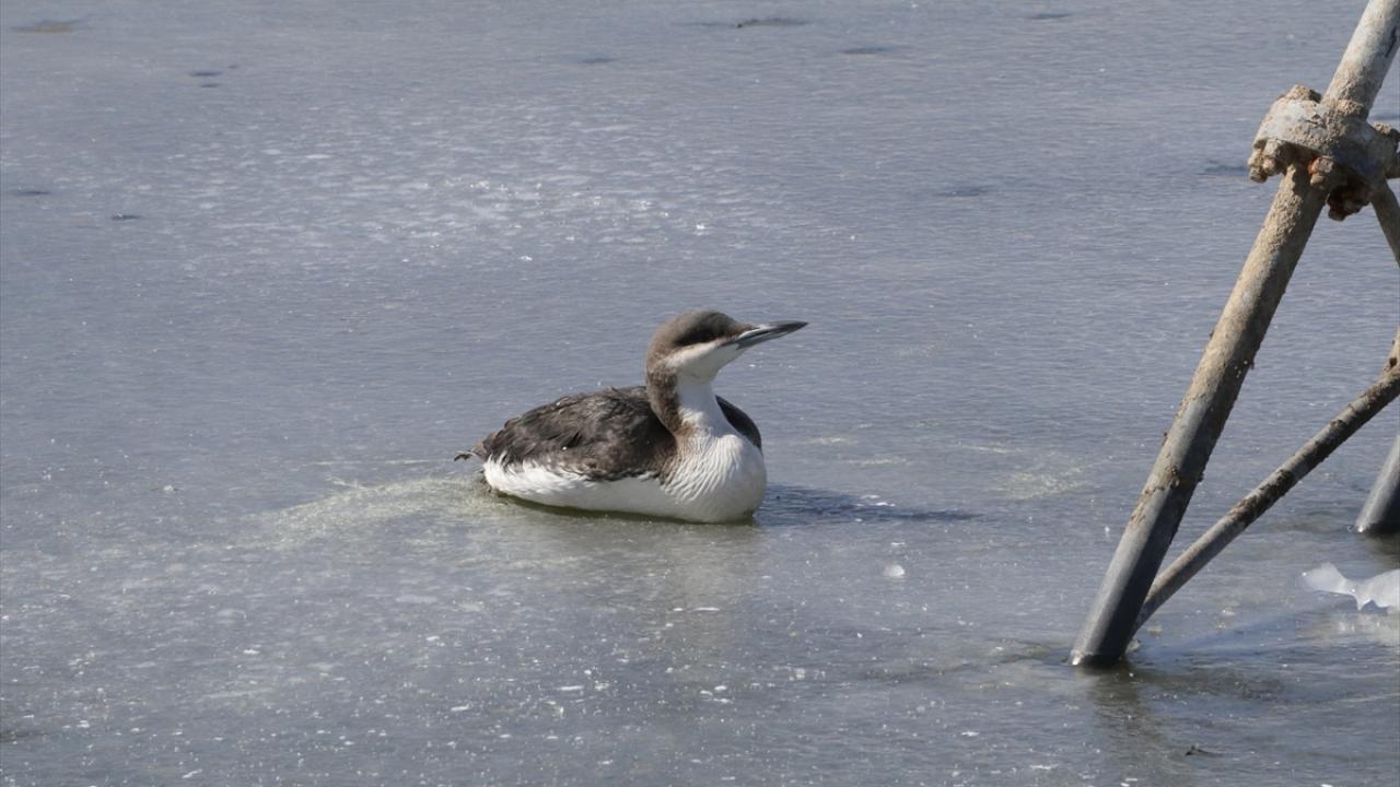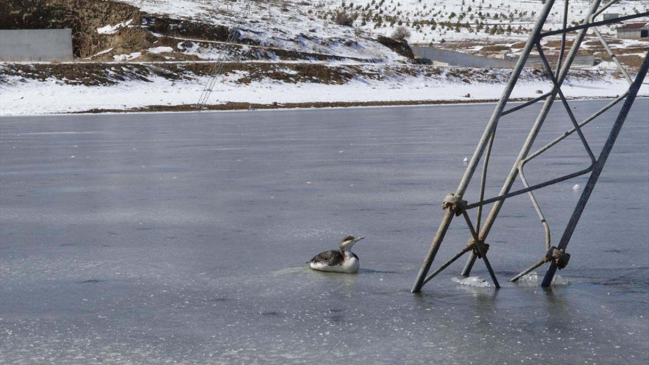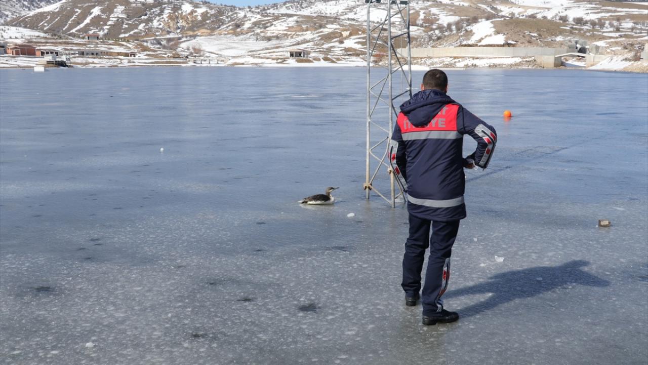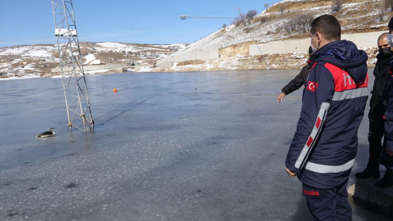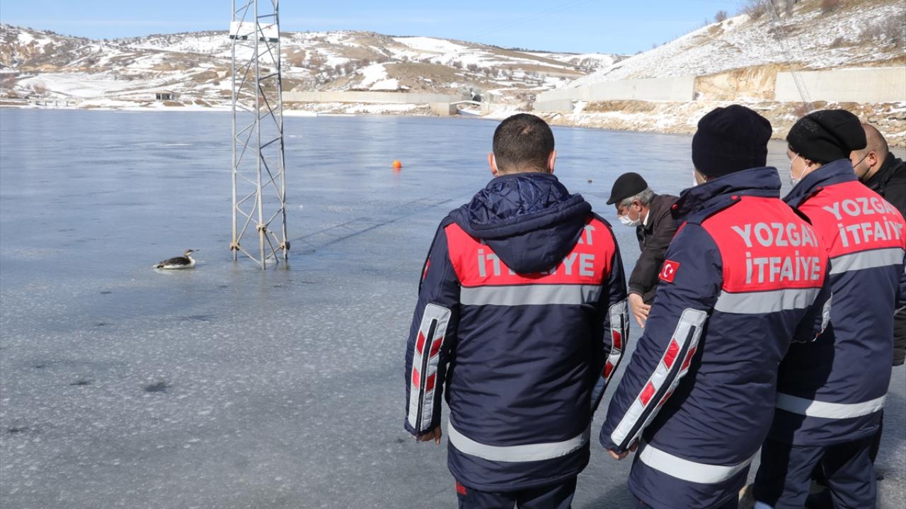 Buz tutan gölde mahsur kalan kara gerdanlı dalgıç kuşunu itfaiye ekipleri kurtardı.
