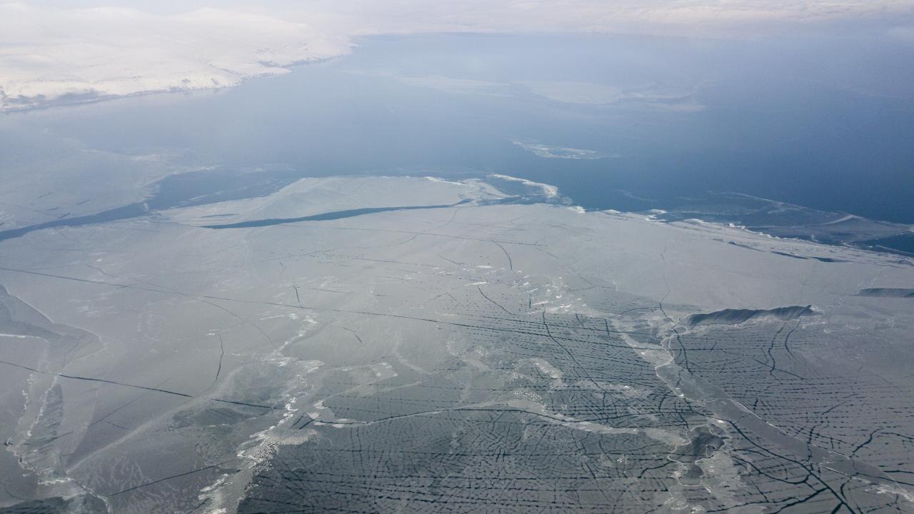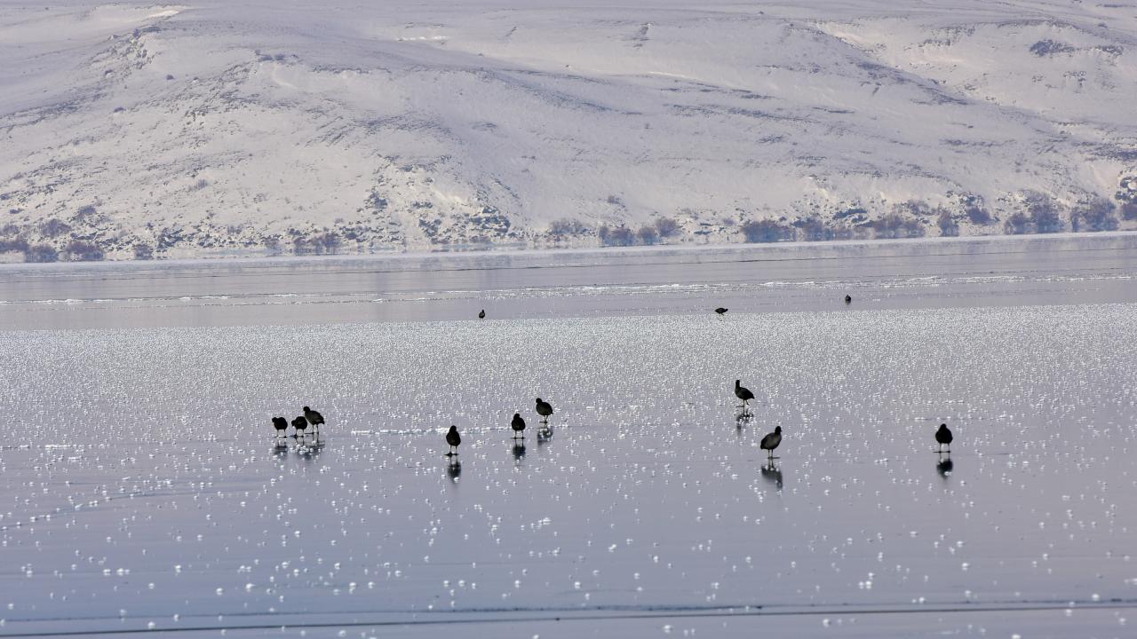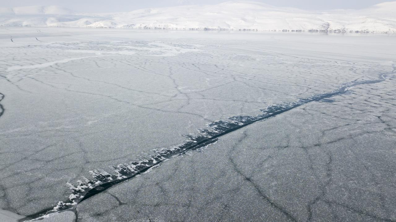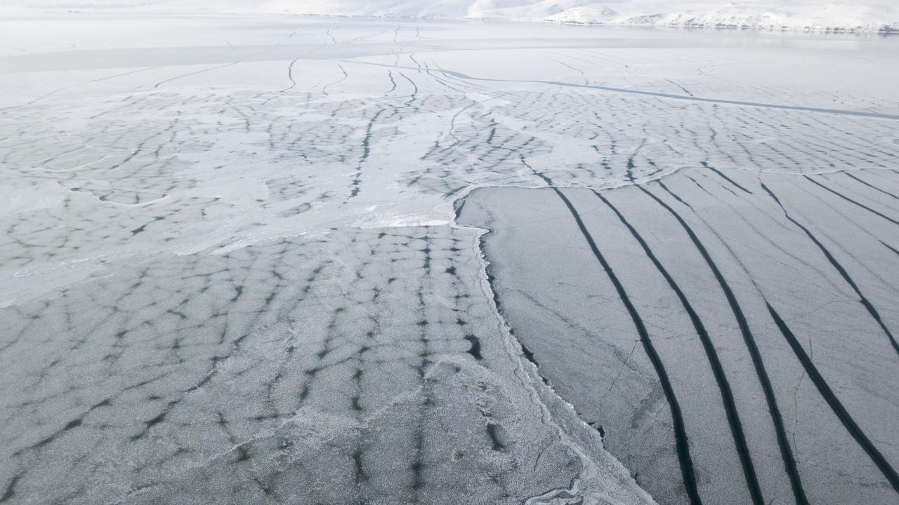 Hava sıcaklığının gece eksi 20 dereceye kadar düştüğü bölgede buzla kaplanan Nazik Gölü’nün değişik desenlere bürünen yüzeyi ve göl üzerindeki kuşlar havadan drone ile görüntülendi.