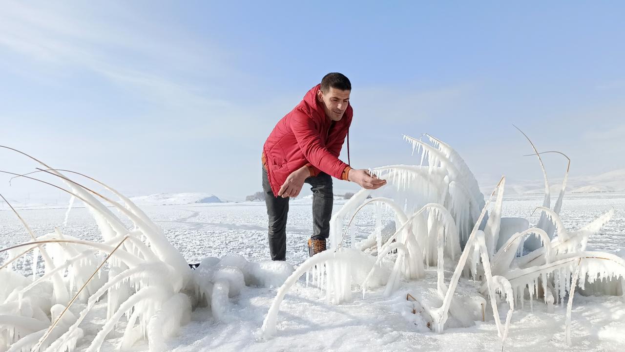 Bitlis’in Ahlat ilçesindeki 40 kilometrekarelik alana sahip Nazik Gölü’nün donmuş hali havadan görüntülenirken, etrafında bulunan ağaç ve çalılıklarının buz tutması ise Sibirya’yı aratmıyor.