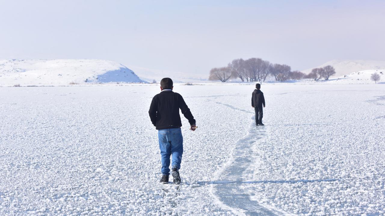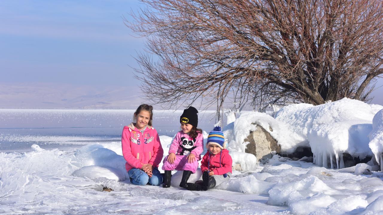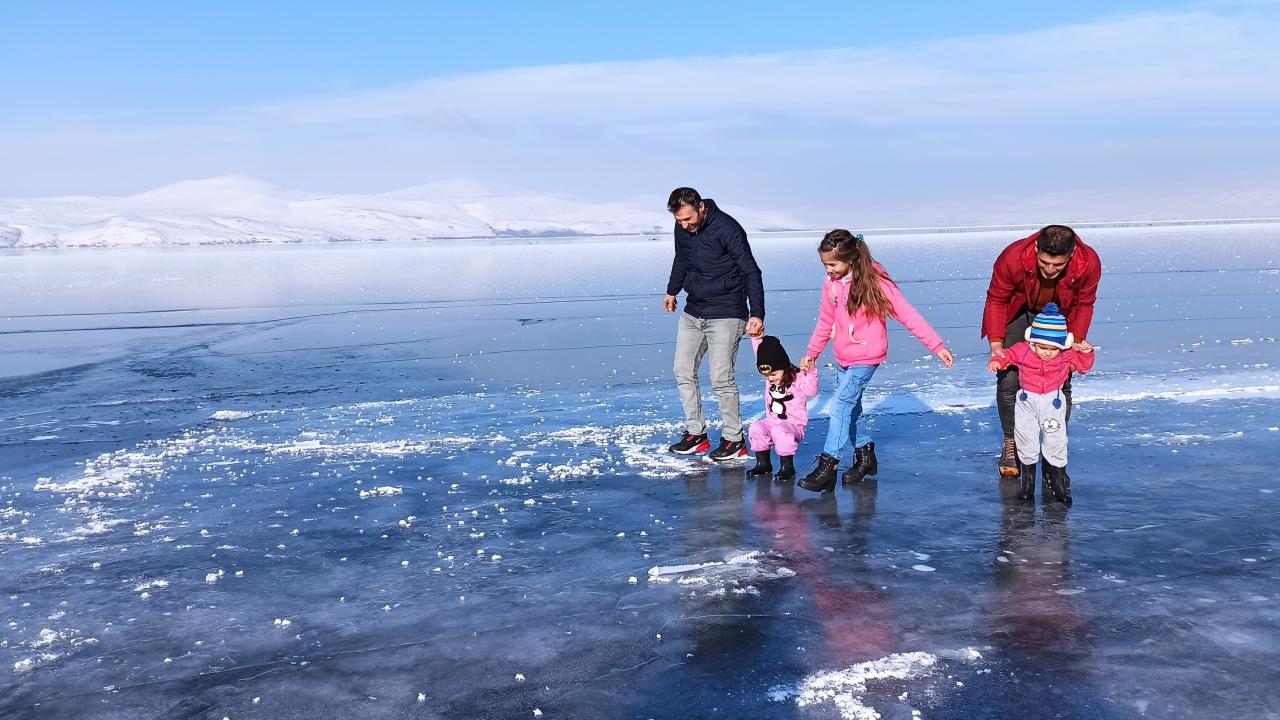 Göle kıyısı bulunan köylerdeki çocuklar ise buz tutan göl yüzeyinde oyunlar oynayarak eğleniyor.