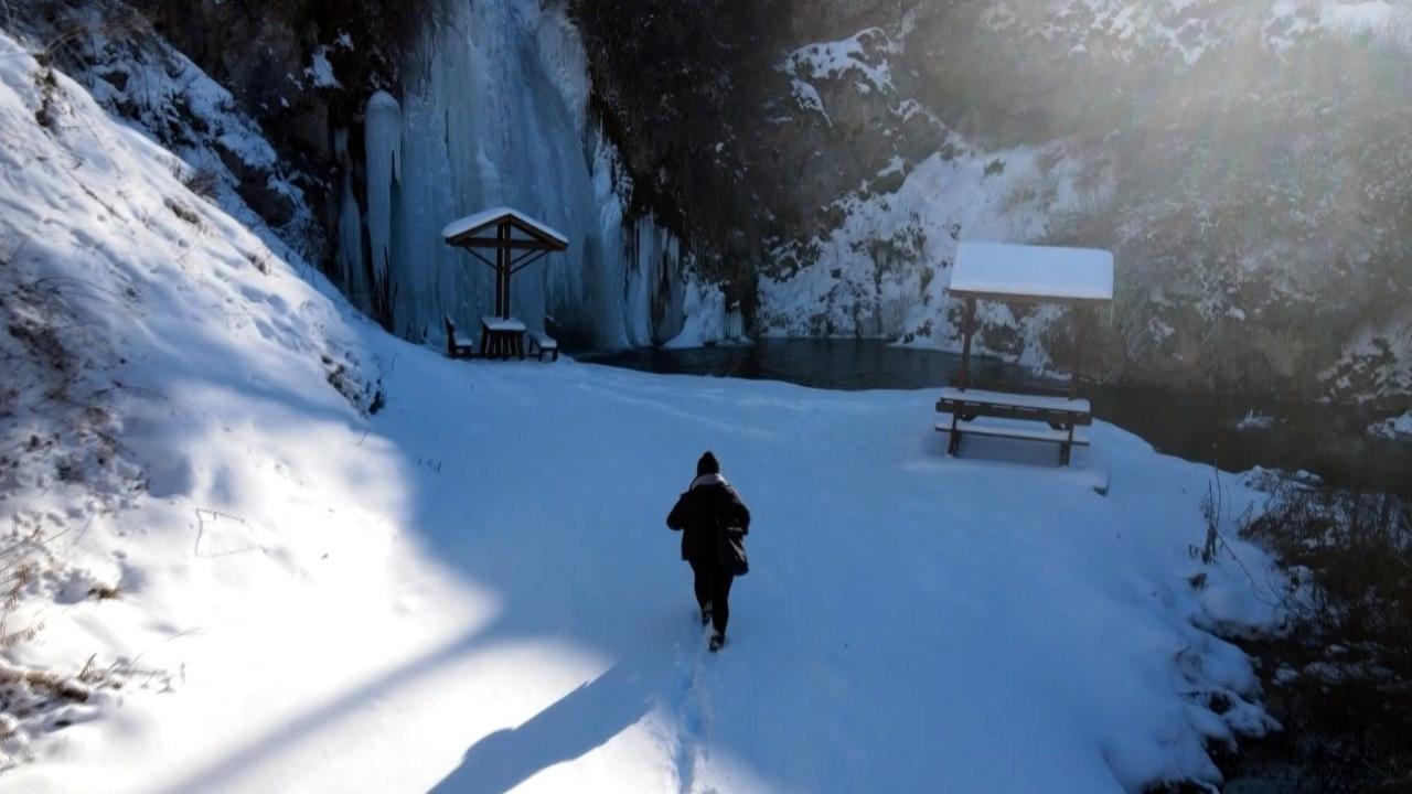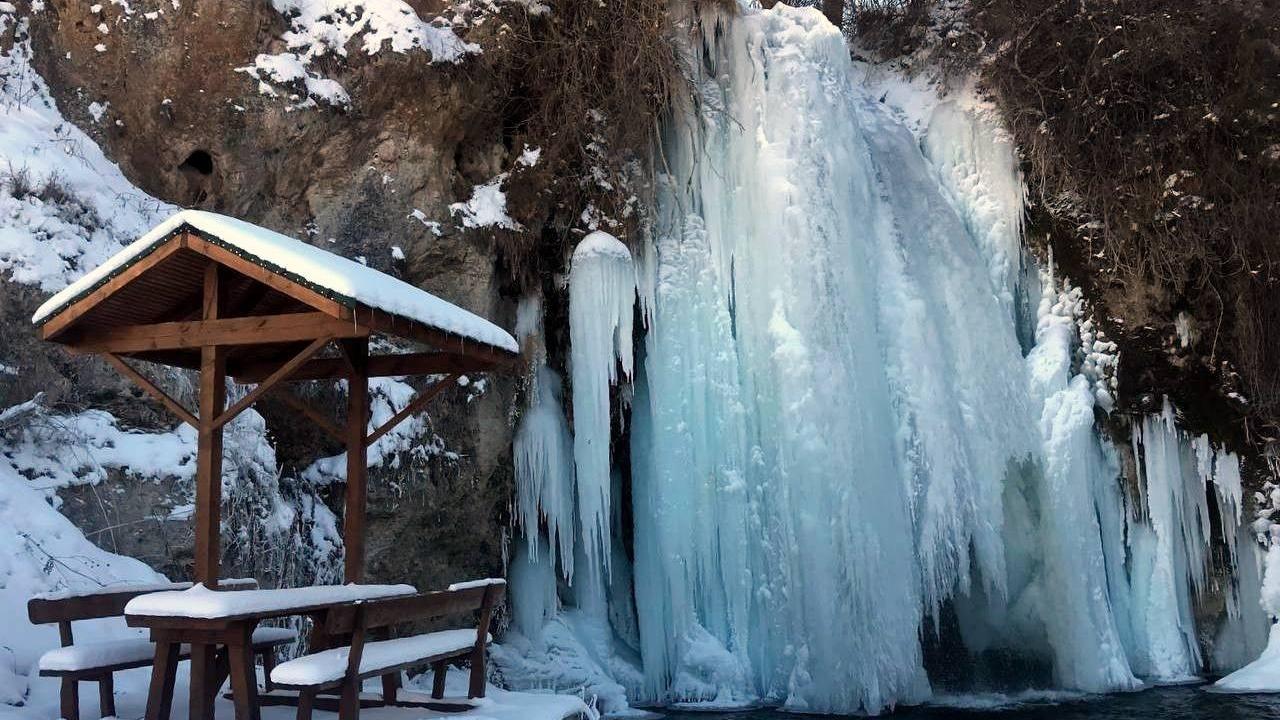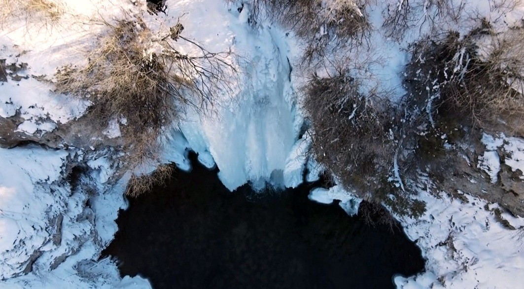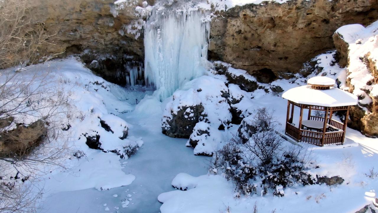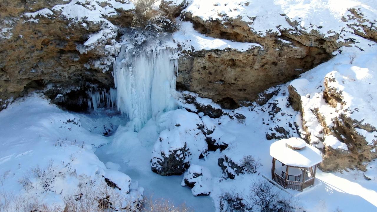 Bayburt`ta soğuk havanın etkisiyle donan Sırakayalar Şelalesi, adeta buzdan "görsel şölen" sunuyor.