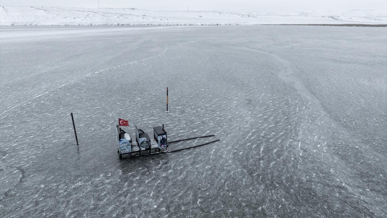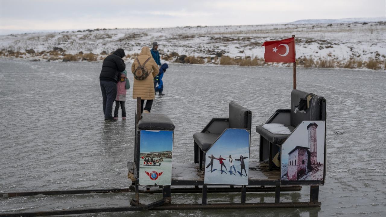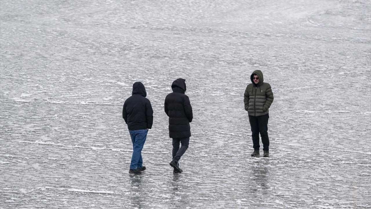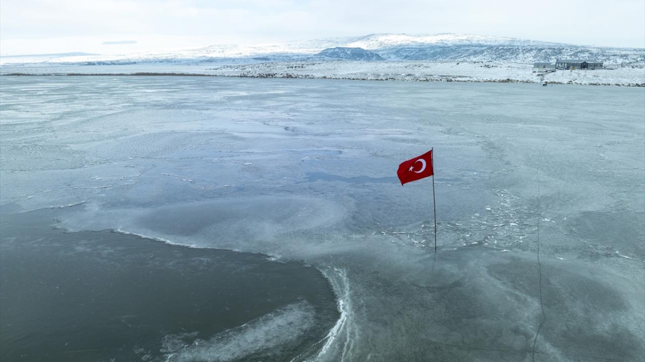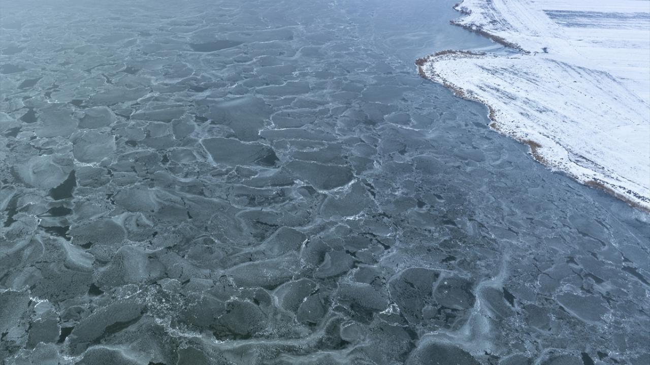 Doğu Anadolu Bölgesi`nde Van Gölü`nden sonra ikinci büyük göl olan Çıldır Gölü yüzeyinin bir bölümü, soğuk havanın etkisiyle dondu.