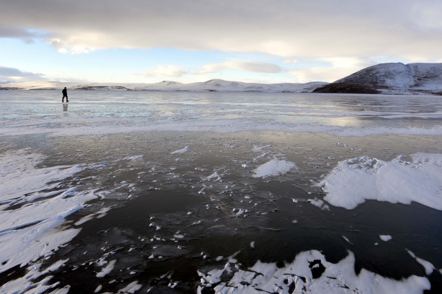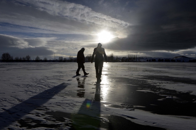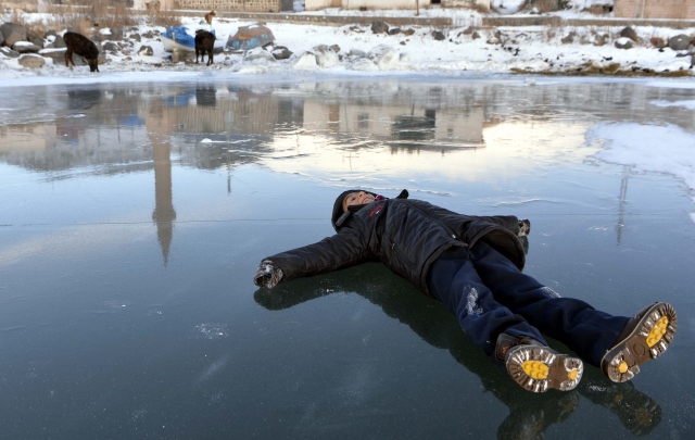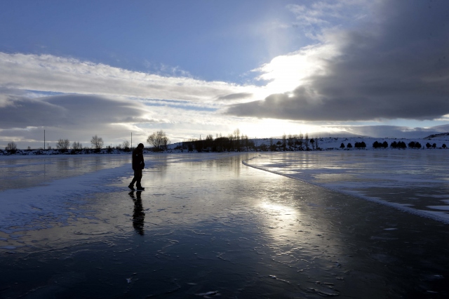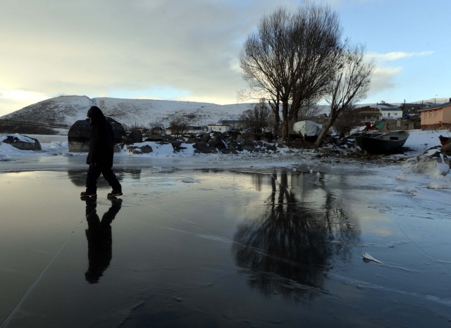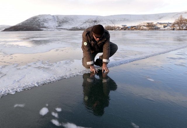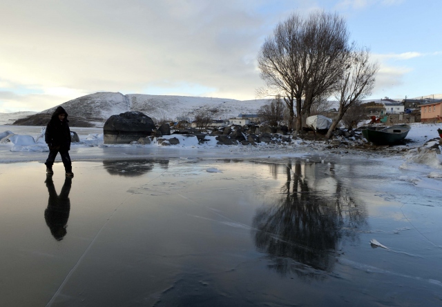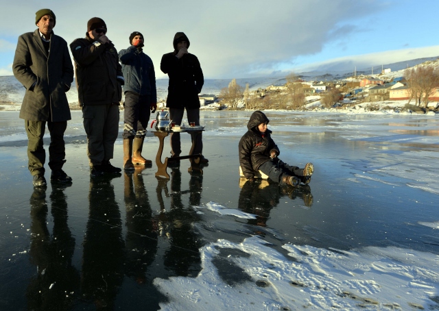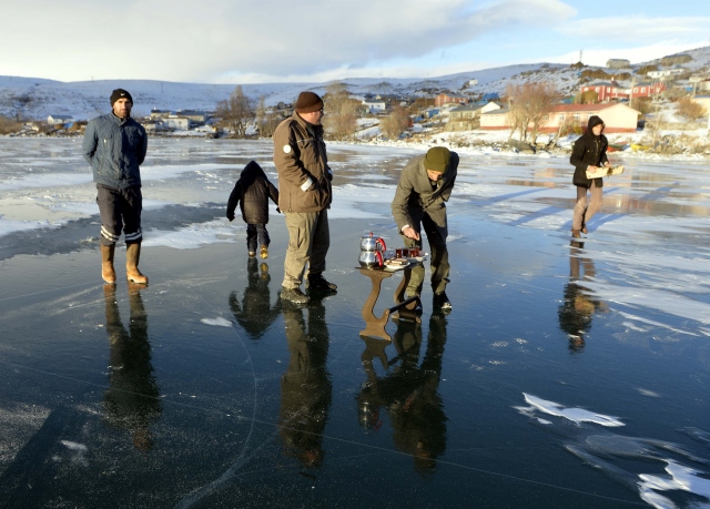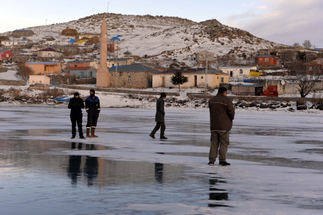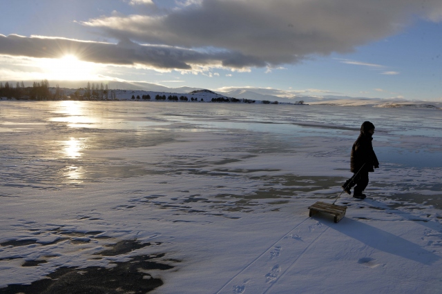 Hava sıcaklığının gece sıfırın altında 26 derecelere kadar düştüğü Ardahan'da, tamamen buz tutan Çıldır Gölü'nde çay ve kızak keyfi yaptılar.