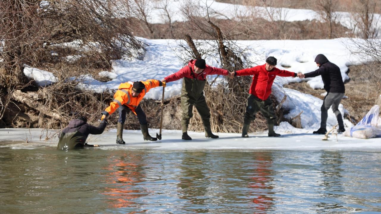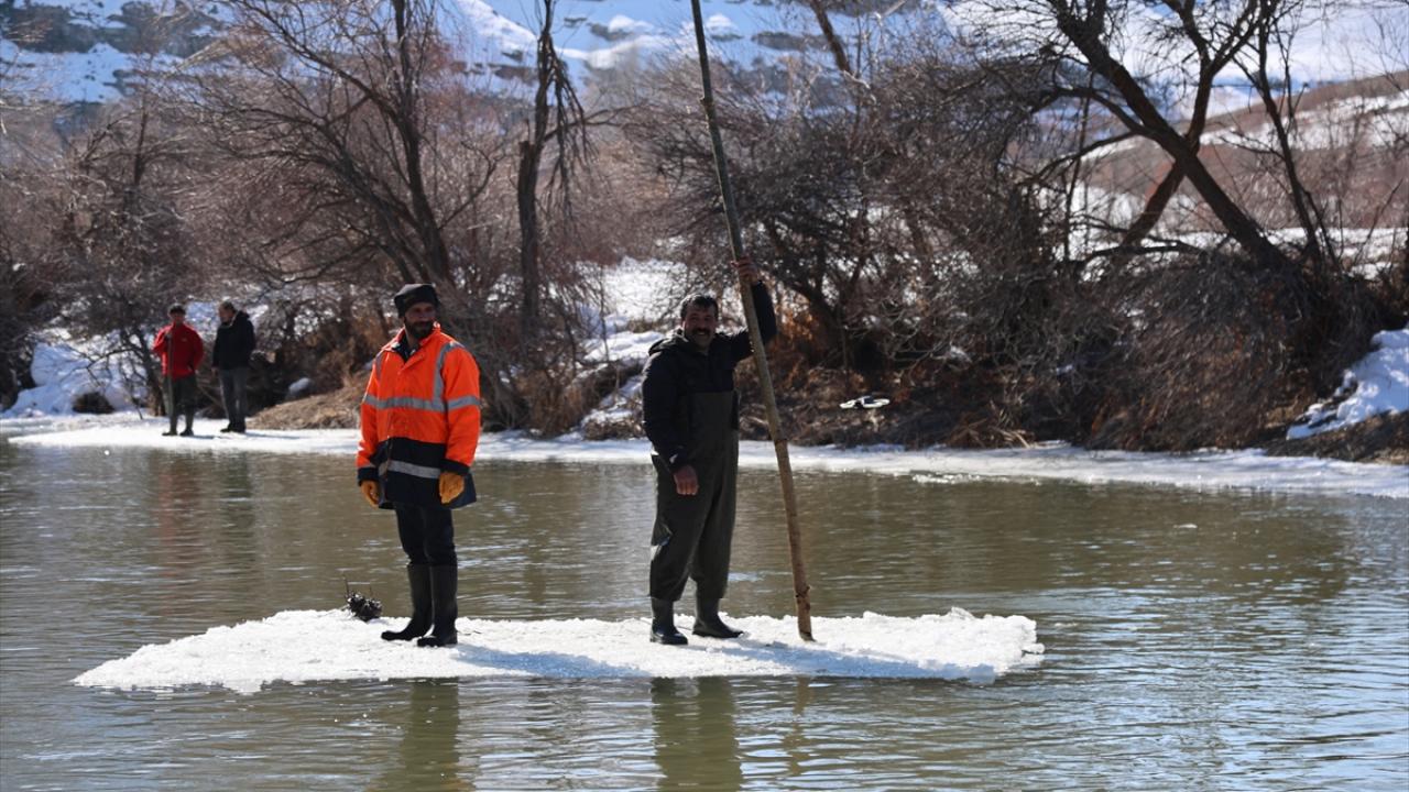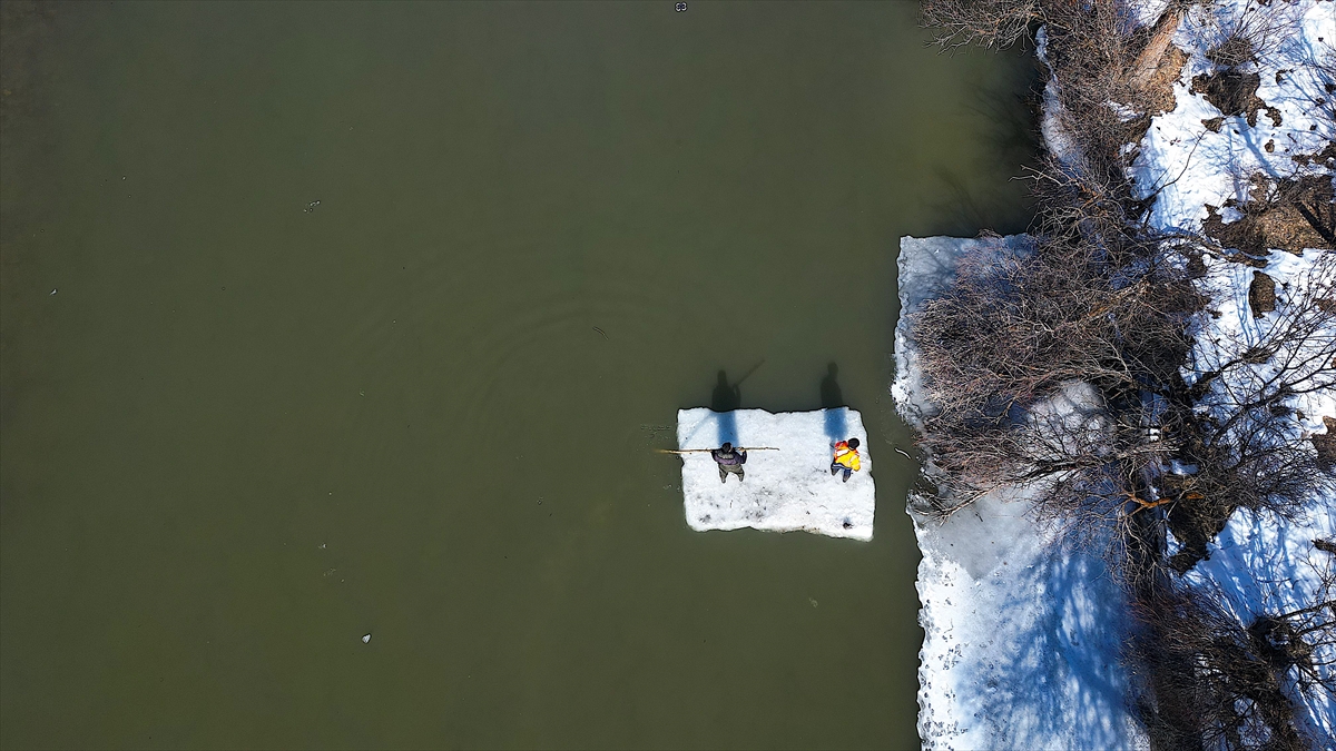 Balıkçılar, debinin yüksek olduğu kısımlarda buzu kırıp sal gibi kullanarak nehrin karşı tarafına ulaşıyor.
