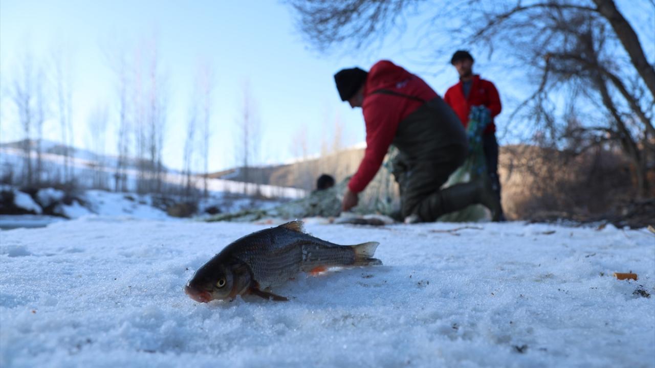 Merkeze bağlı Bayraktar köyü sakinleri, hava sıcaklığının sıfırın altında 20 dereceye kadar düştüğü bu dönemde, boş zamanlarını geleneksel yöntemlerle balık avlayarak değerlendiriyor.