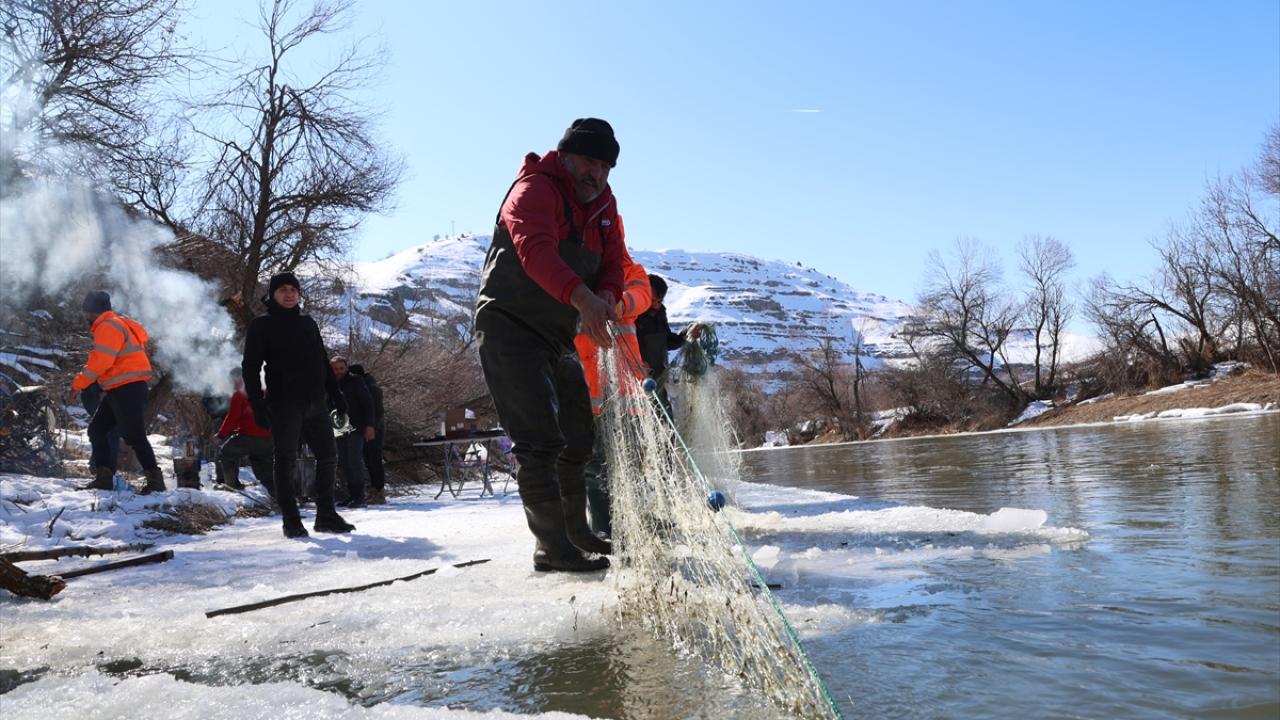 Ağaç dallarıyla buza vurarak ses çıkartan köy sakinleri, bir süre sonra ağlara takılan tatlı su kefali, karabalık, aynalı sazan ve gümüş balıklarını topluyor.