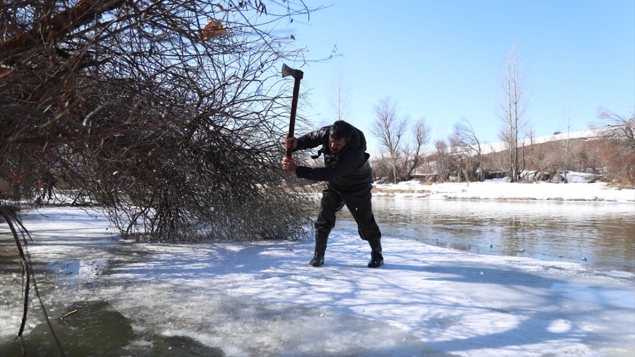 Sabah erken saatlerde nehir kenarına inen amatör balıkçılar, kalınlığı yaklaşık 30 santimetreyi bulan buz tabakasını kazma ve baltayla kırarak ağlarını suya bırakıyor.