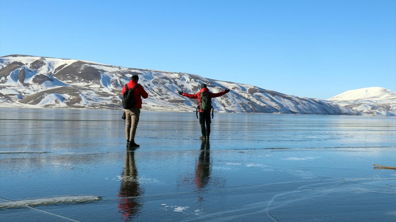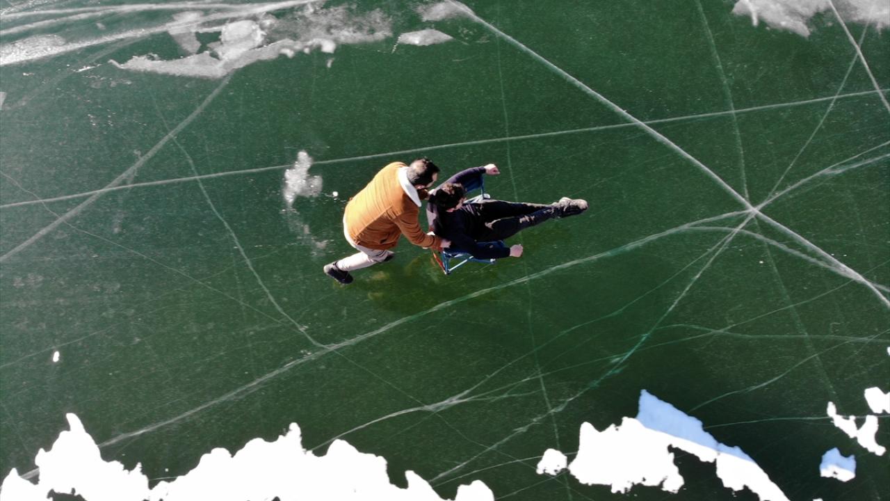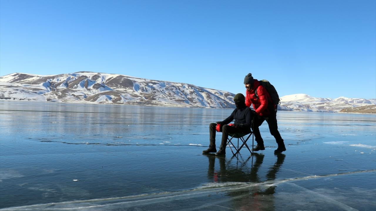 Son günlerde bölgede etkili olan dondurucu soğukların etkisiyle tamamen donan 2 bin 241 rakımdaki göle gelenler buz üzerinde yürüyüş yapıp sandalye ile kayarak eğlenceli zaman geçiriyor.