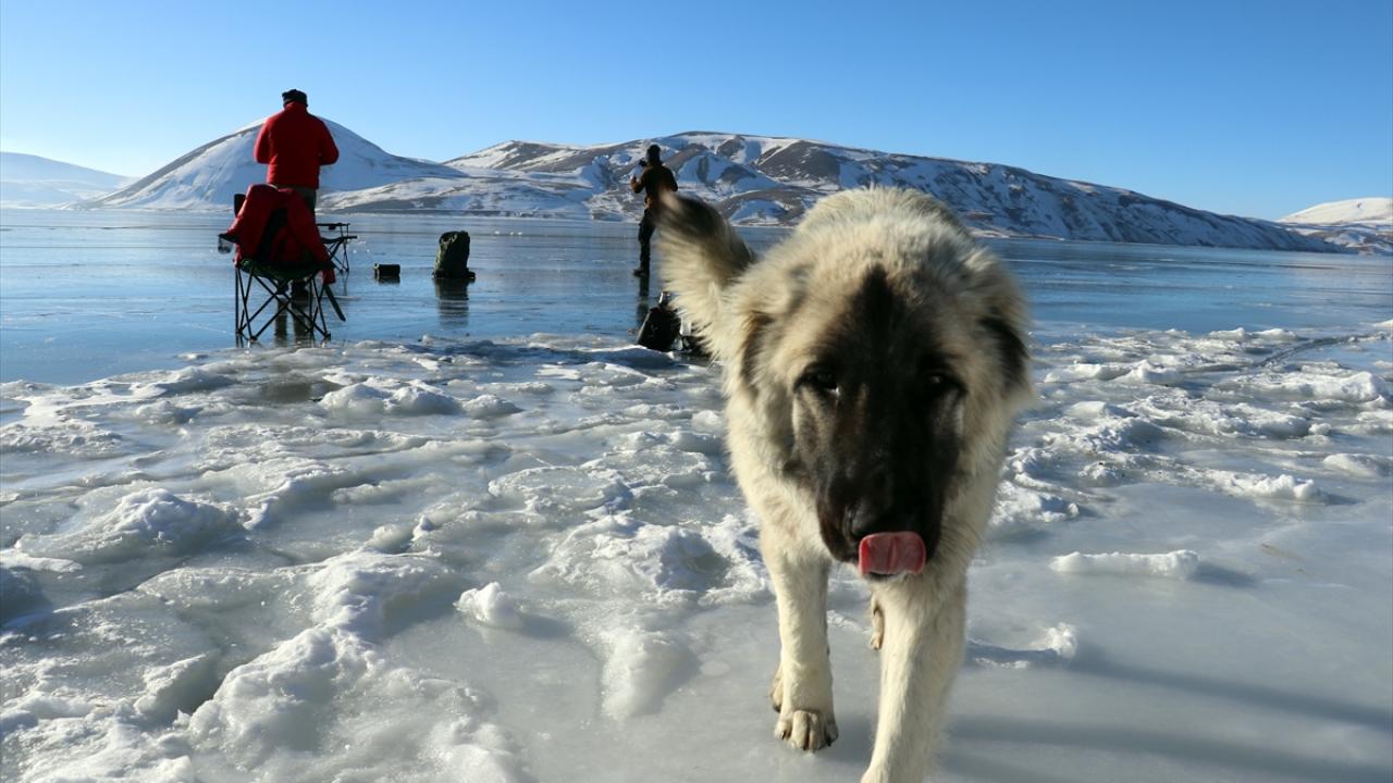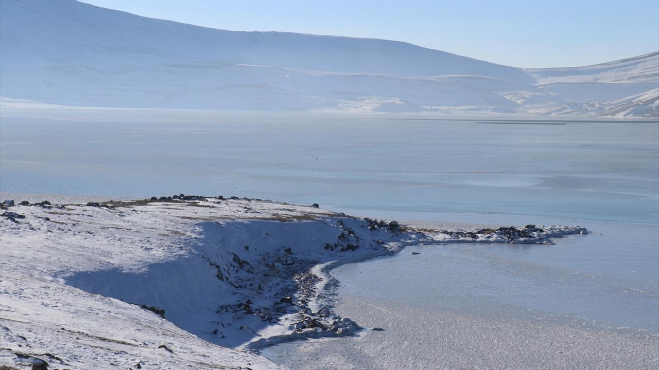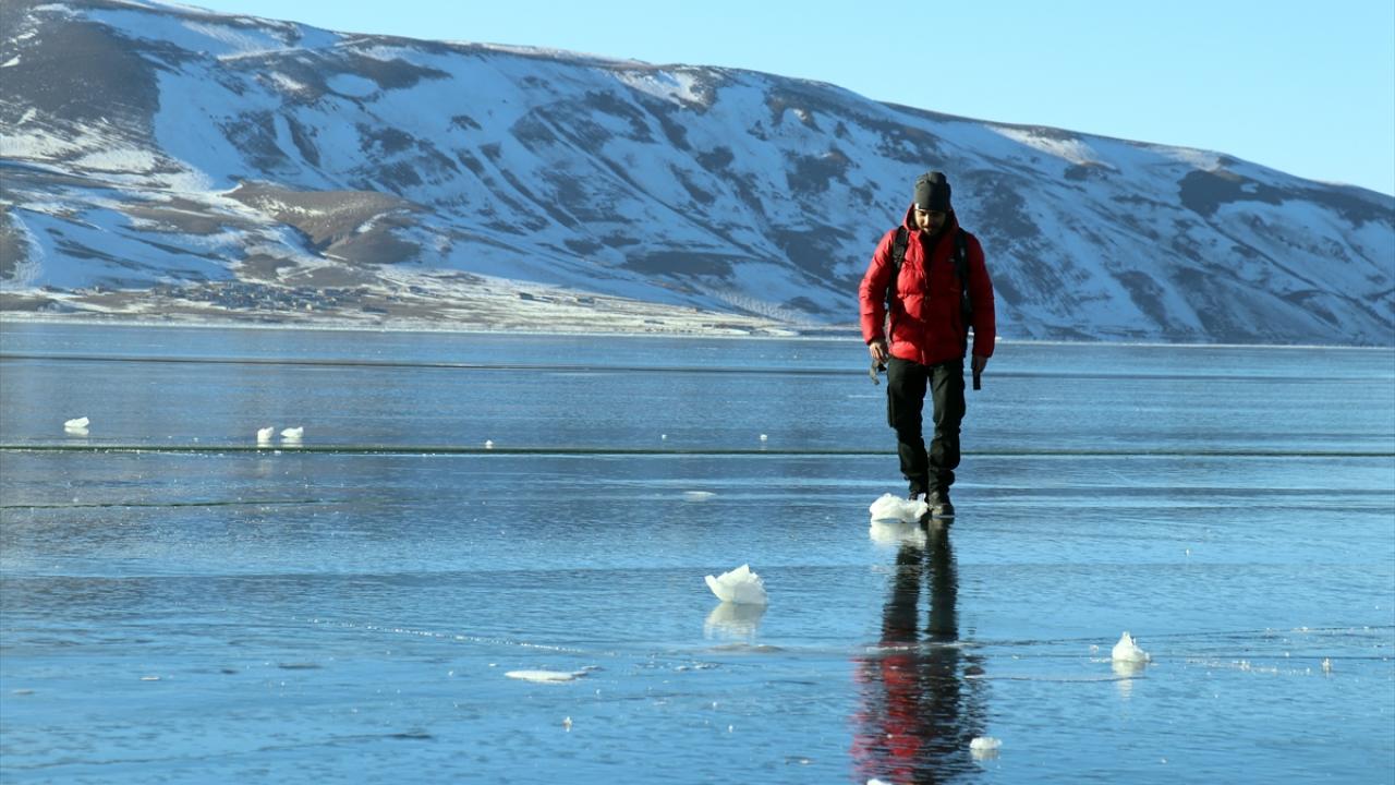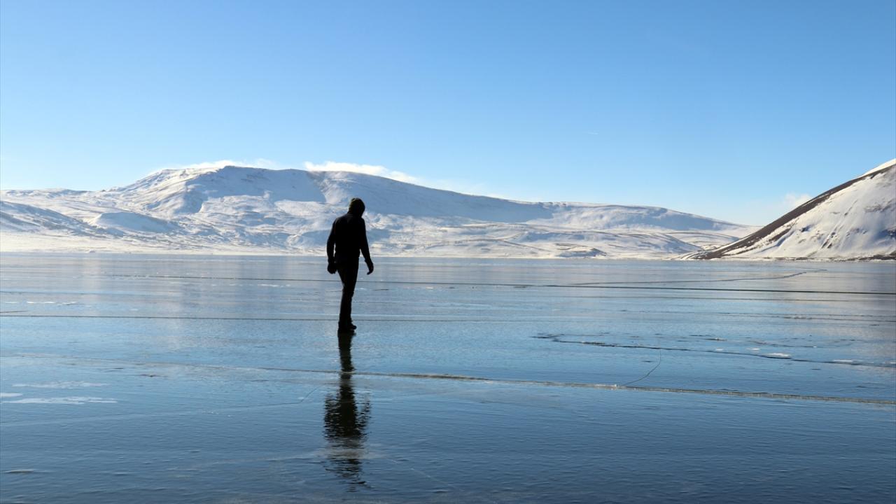 Son günlerde bölgede etkili olan dondurucu soğukların etkisiyle tamamen donan 2 bin 241 rakımdaki göle gelenler buz üzerinde yürüyüş yapıp sandalye ile kayarak eğlenceli zaman geçiriyor.
