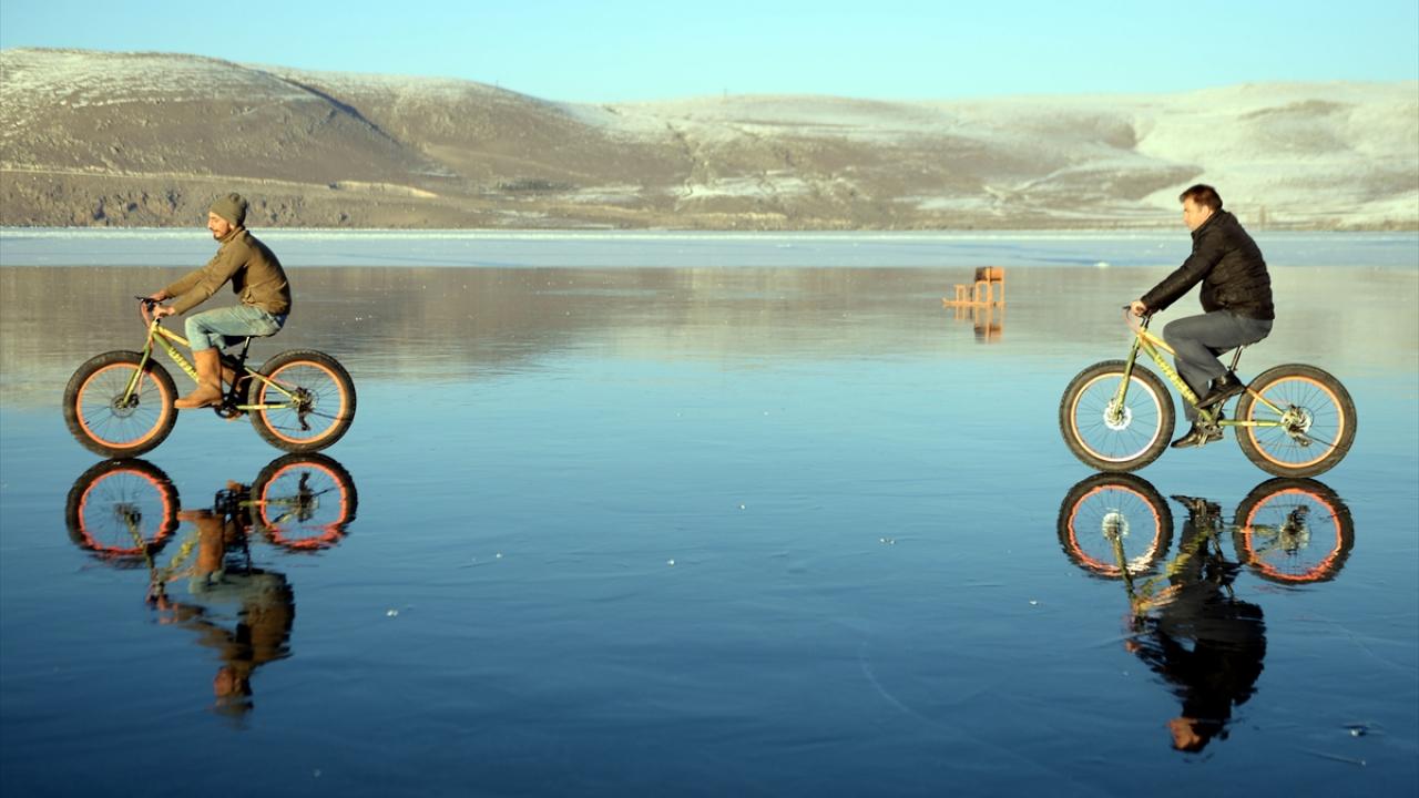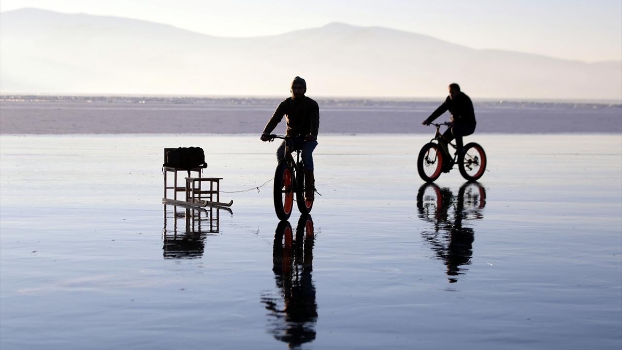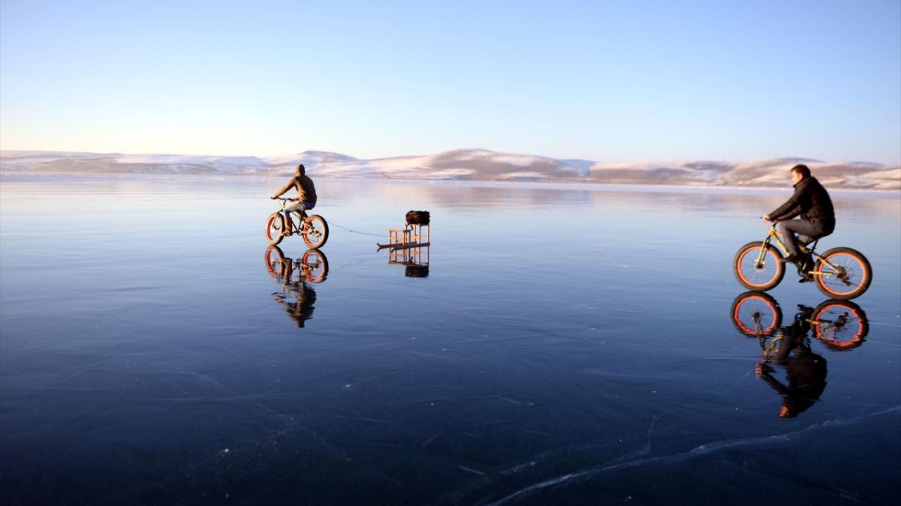 Buzla kaplı Çıldır Gölü'nde bisikletle gezinti keyfi
