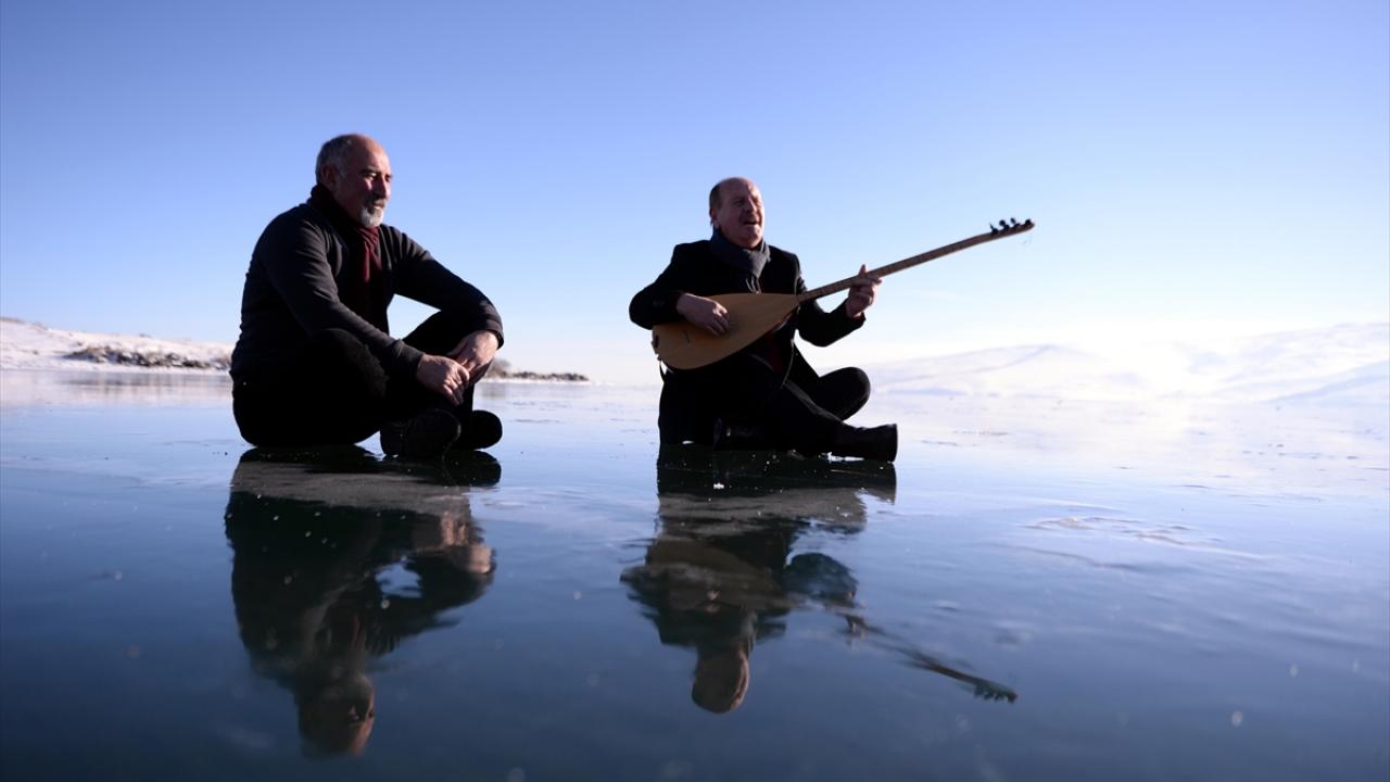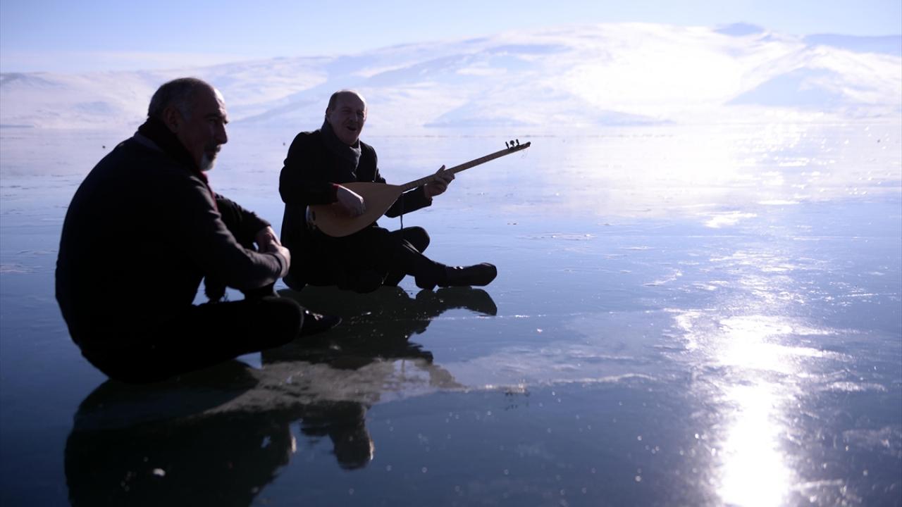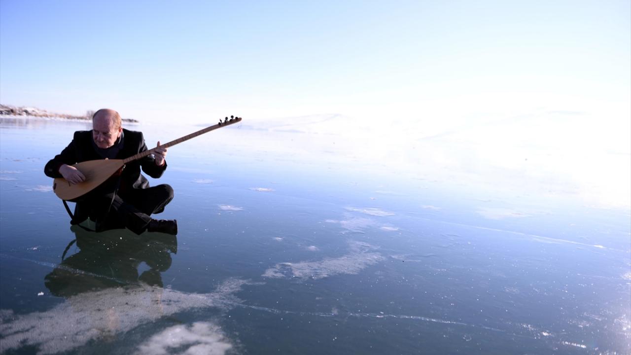 Ardahanlı ozan Yener Yılmazoğlu, yüzeyinin büyük bölümü donan Çıldır Gölü üzerinde, sazını eline alarak birbirinden güzel türküler söyledi.