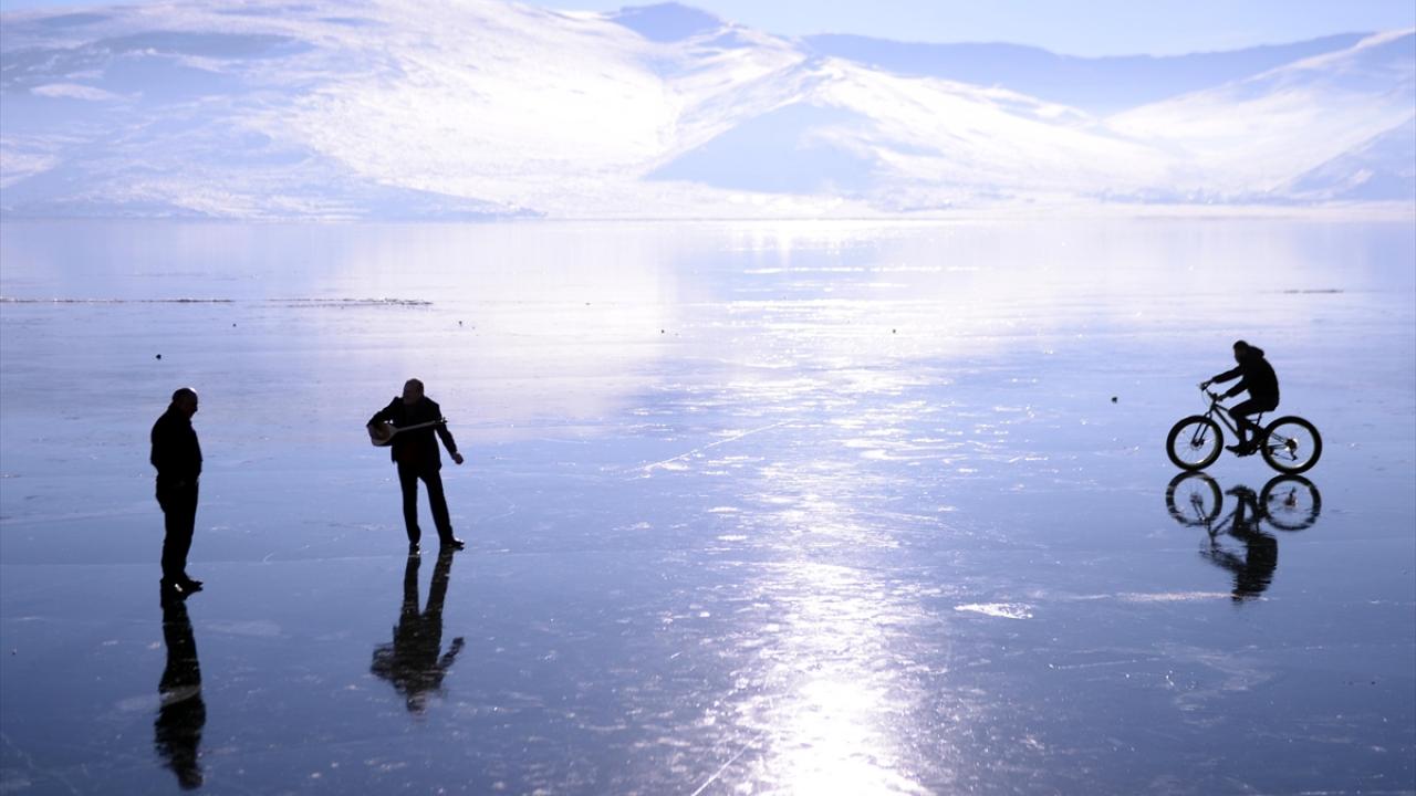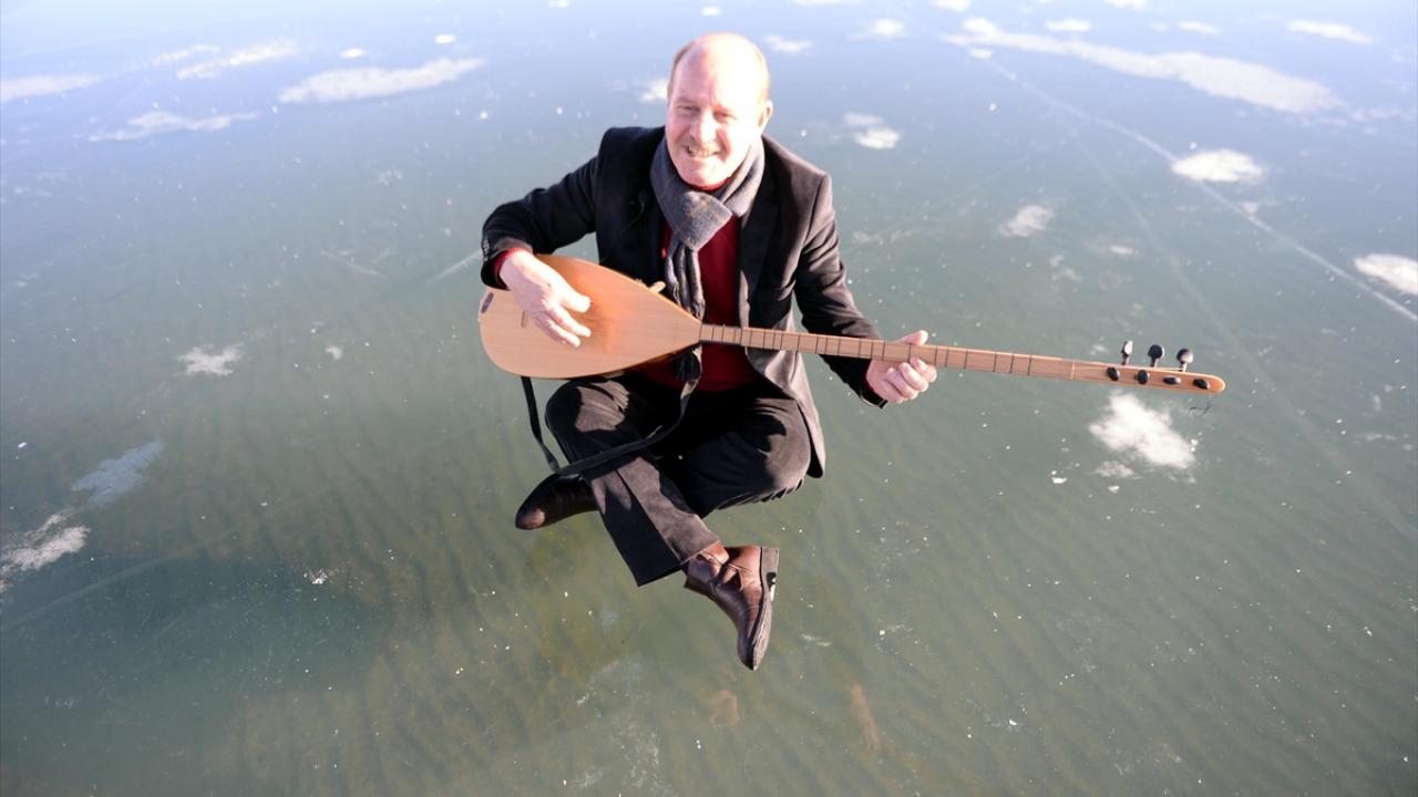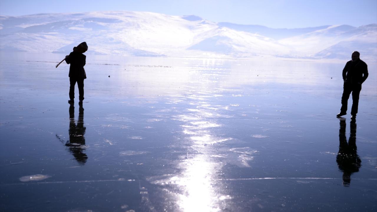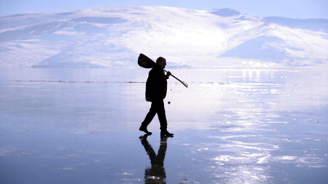 Ardahanlı ozan Yener Yılmazoğlu, yüzeyinin büyük bölümü donan Çıldır Gölü üzerinde, sazını eline alarak birbirinden güzel türküler söyledi.