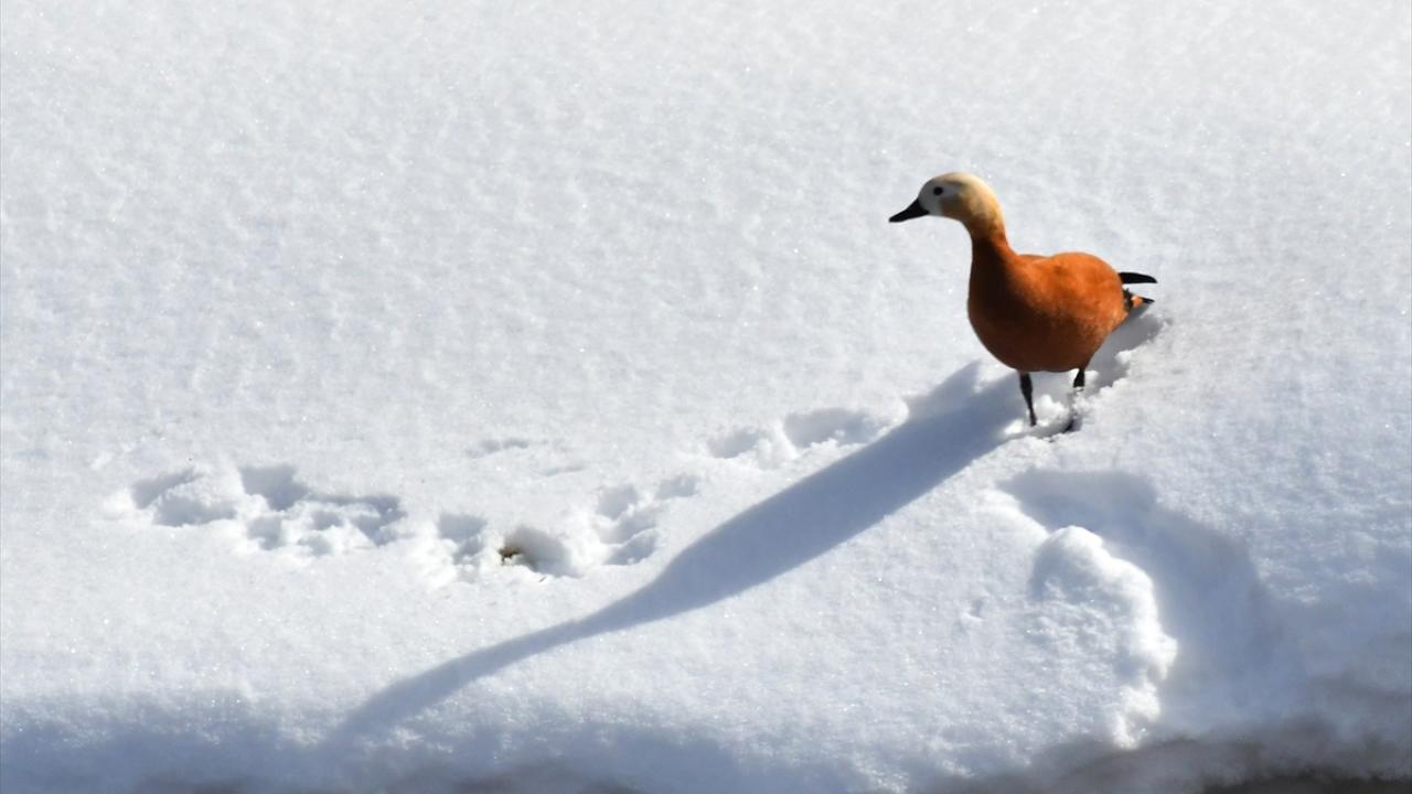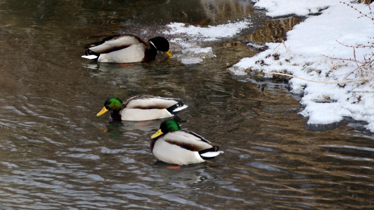 Sarıkamış ilçesinde de karla kaplı buzları çözülen sulak alanlara gelen yaban kuşları yiyecek ararken görüntülendi.