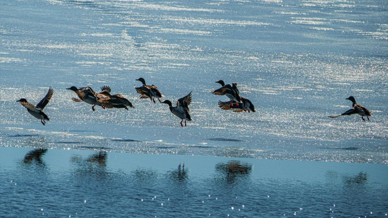 Kenarları çözülmeye başlayan Kars Barajı`na angıt, yeşilbaş ördek, sakarmeke ve karabataklar geldi. Bazı bölümleri halen buzla kaplı olan barajda yiyecek arayan kuşlar güzel görüntüler oluşturdu.
