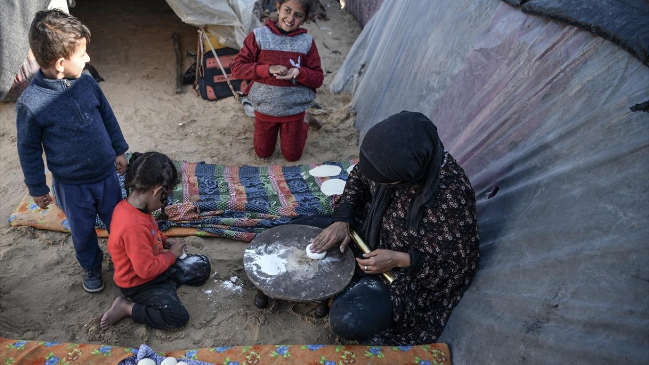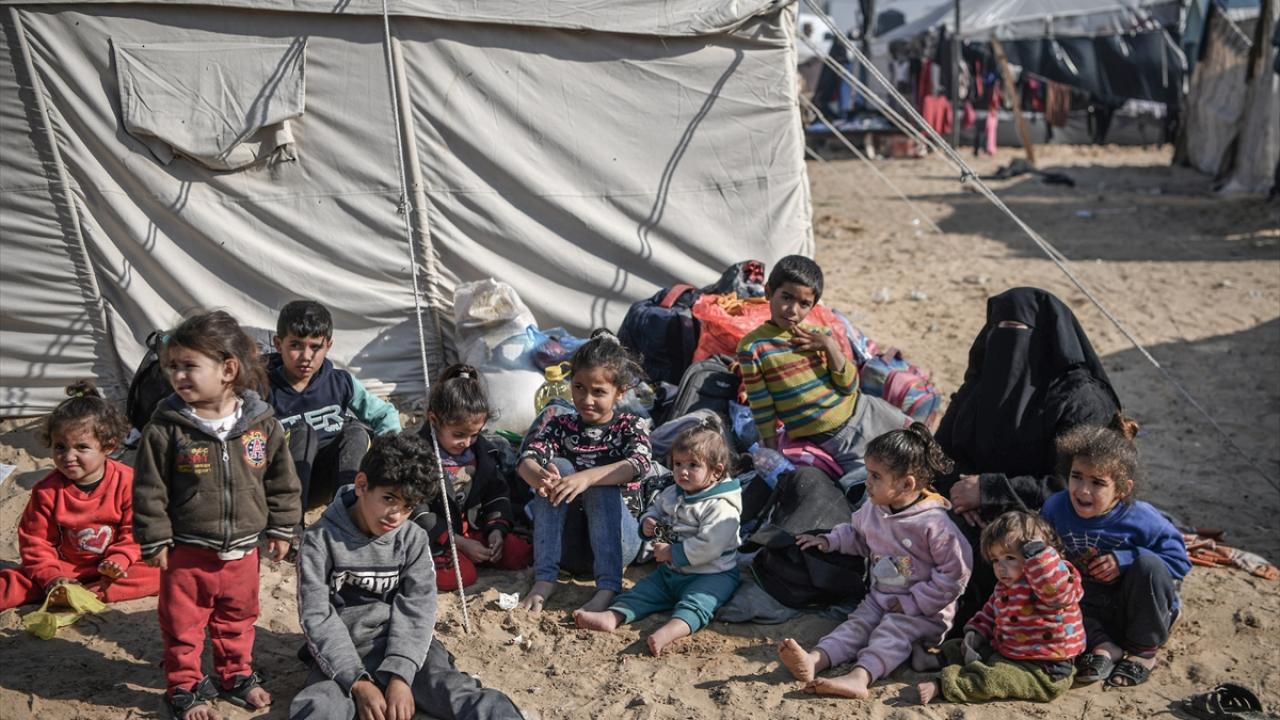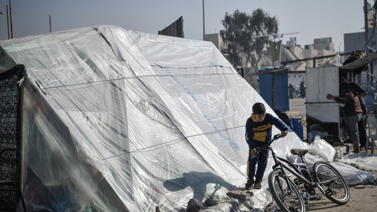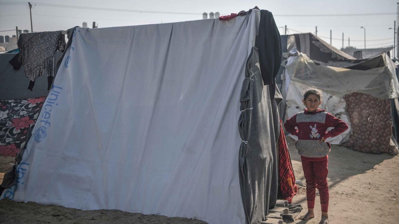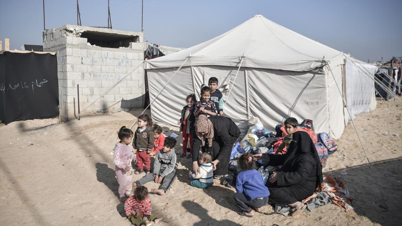 İsrail bombardımanından korunmak ve can güvenliklerini sağlayabilmek için evlerini terk edip Refah kentine sığınan Filistinli aileler, boş arazide kurdukları derme çatma çadırlarda soğuk hava şartlarıyla mücadele ediyor.