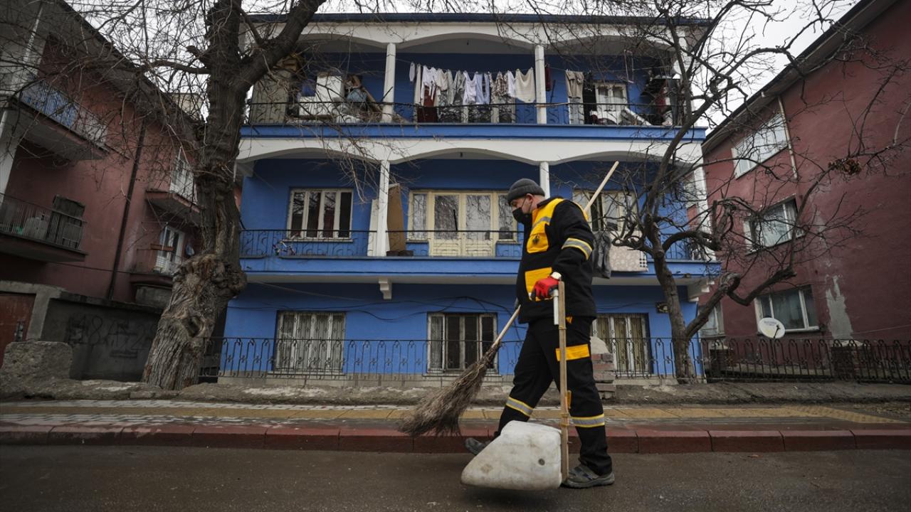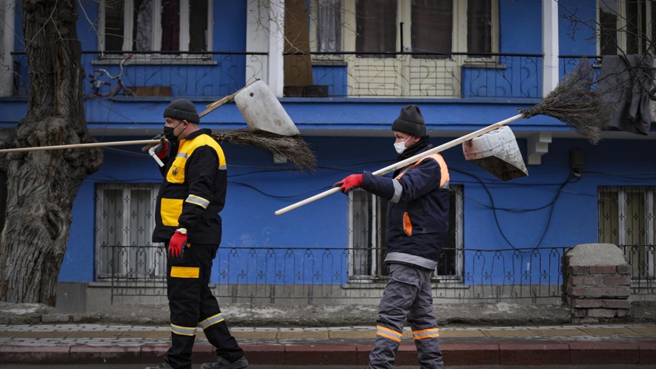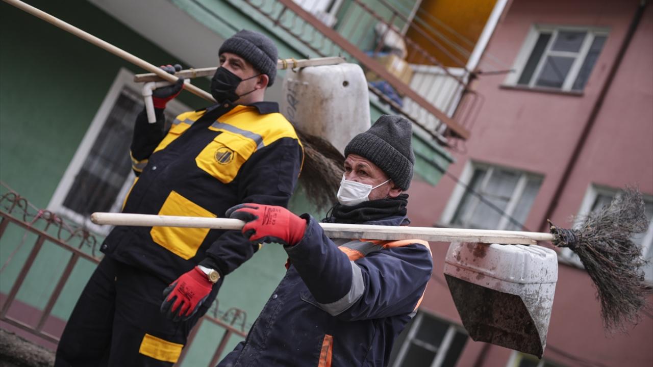 Belediyelerin temizlik işçileri, büyük araçlarının giremediği ara sokakları ve kaldırımları, örüp bağlayarak hazırladıkları çalı süpürgeleriyle temizliyor.
