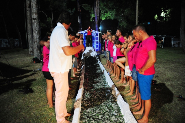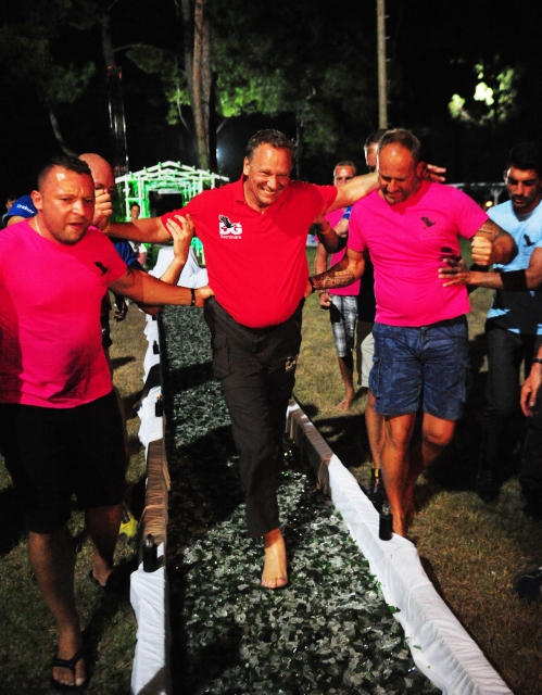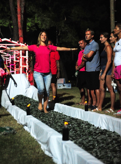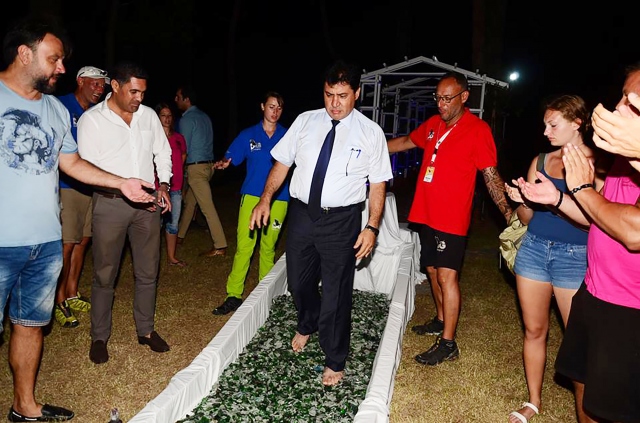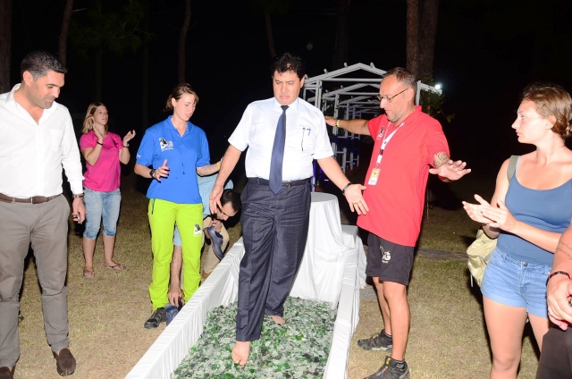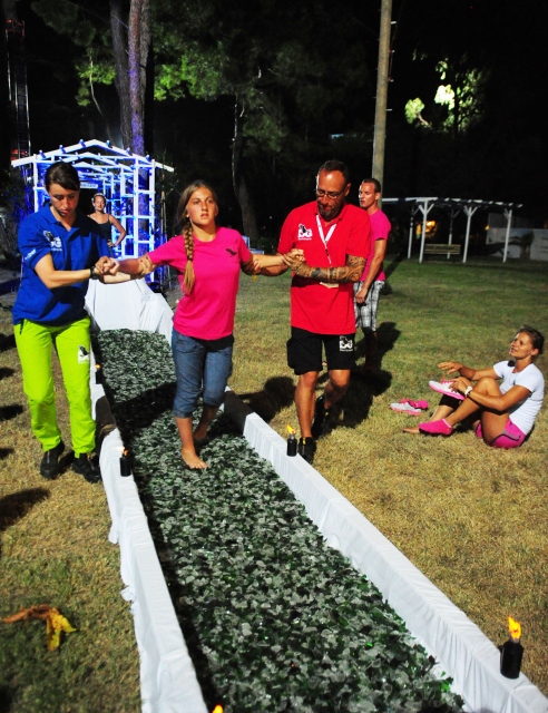 Antalya'nın Kemer ilçesinde düzenlenen, mental antrenman ve kişisel hedef eğitimine katılanlar, cam kırıkları üzerinde yürüyerek öz güvenlerini sınadı.