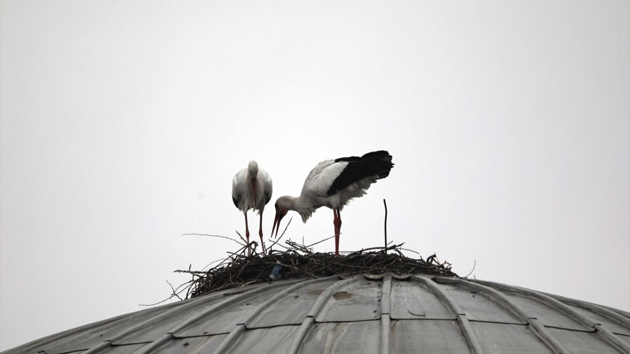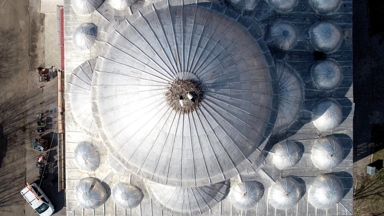 Cami kubbesine yuva yapan 2 leylek 4 yıldır göç etmedi
