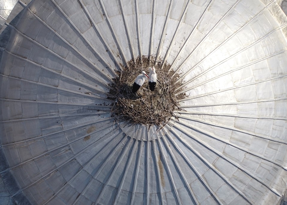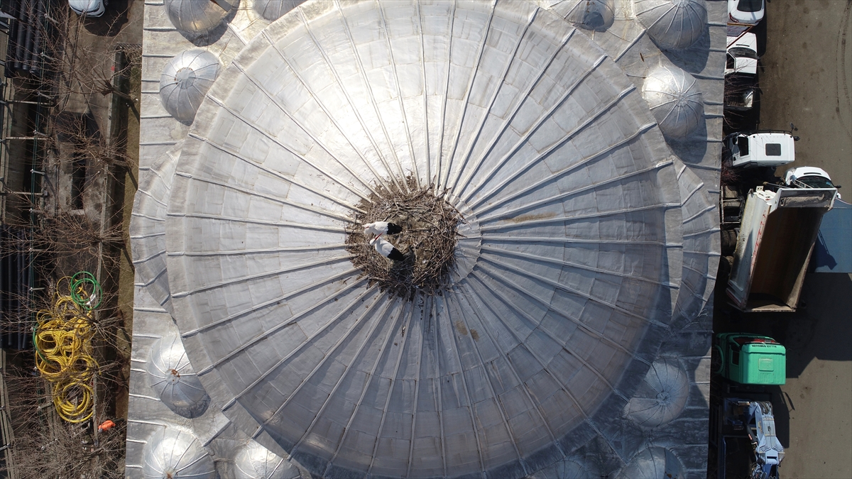 Havanın soğumaya başlamasıyla göç etmesi beklenen leyleklerden 2`si, Sanayi Sitesi Camii`nin kubbesindeki yuvalarından çetin kış koşullarına rağmen 4 yıldır ayrılmadı.