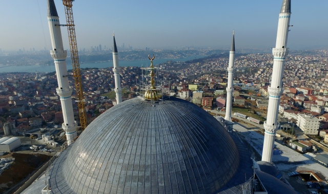 Çamlıca Camisinin 7,77 metre yüksekliğinde, 4,5 ton ağırlığındaki ana kubbe alemi törenle yerine yerleştirildi.