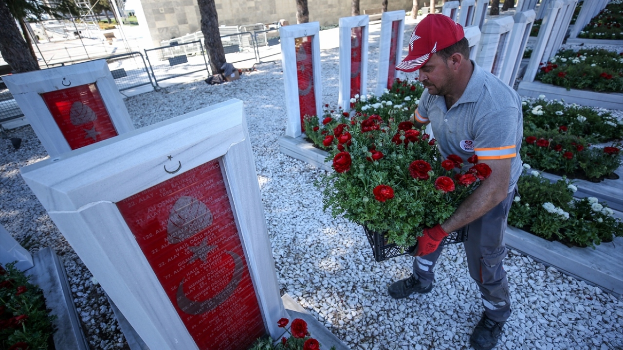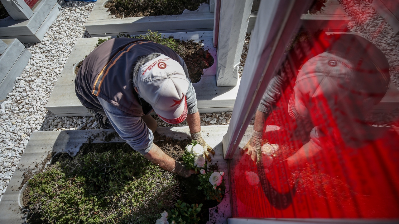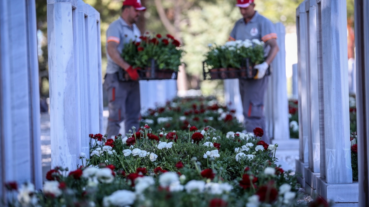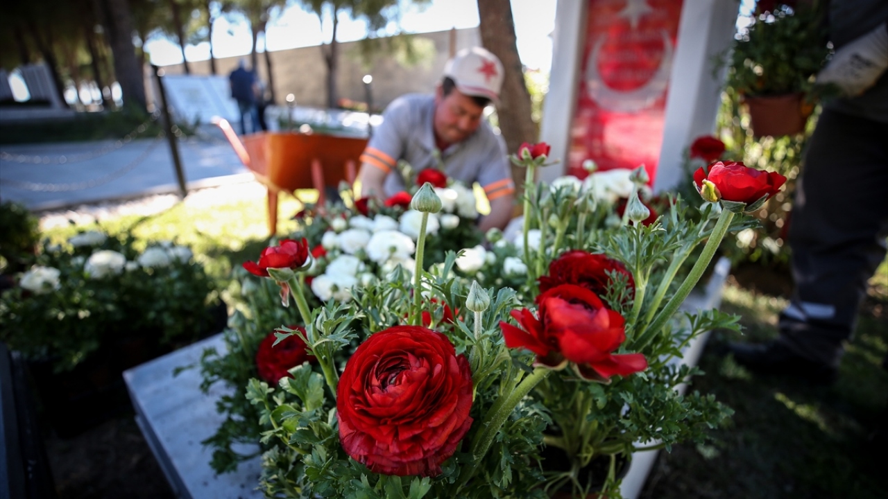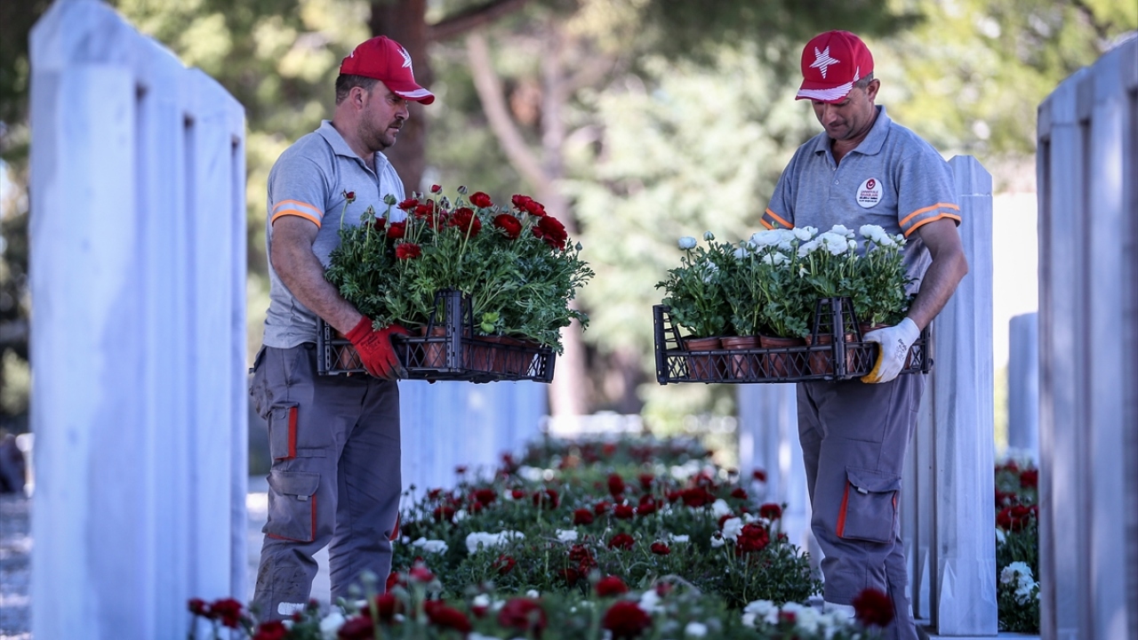 Peyzaj ekibi bünyesindeki bahçıvanlar, Türkiye`nin çeşitli illerinden getirilen 11 bin kırmızı beyaz şakayığı tek tek şehit mezarlıklarına dikti.