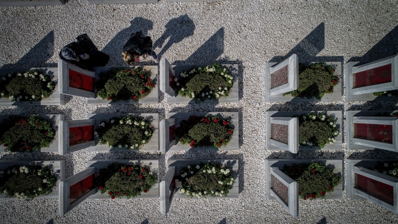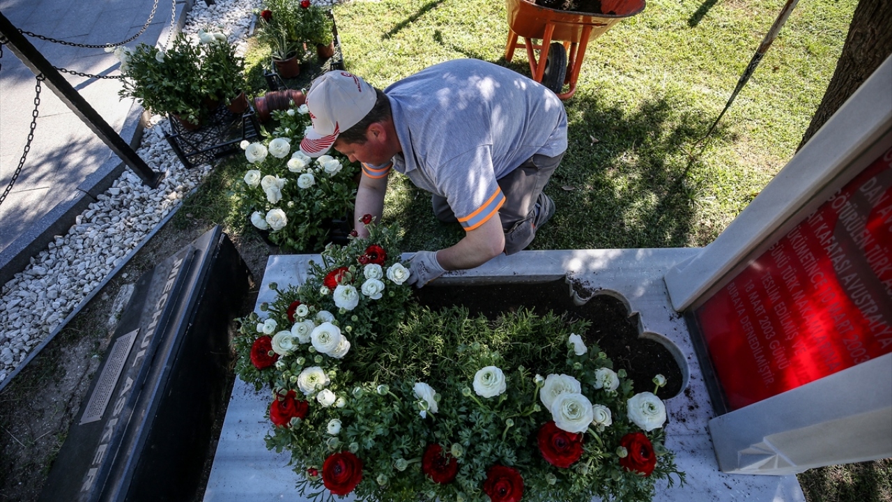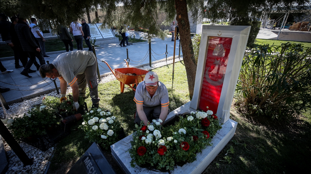 18 Mart Şehitleri Anma Günü ve Çanakkale Deniz Zaferi'nin 105'inci yılı hazırlıklarının sürdüğü Şehitler Abidesi bölgesindeki şehit mezarlarına görevlilerce binlerce şakayık dikildi