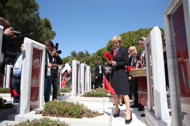 Avustralya Dışişleri Bakanı Julie Bishop, Çanakkale Kara Savaşları`nın 102. yıl dönümü dolayısıyla düzenlenen törenlere katılarak şehitliğe karanfil bıraktı.