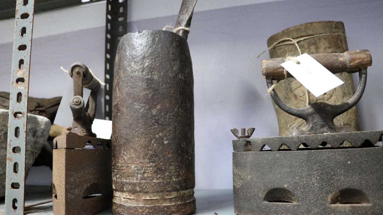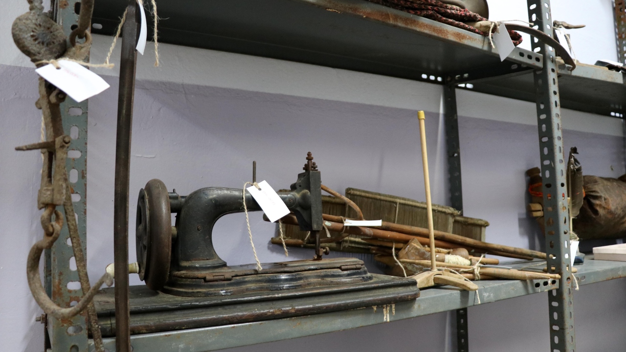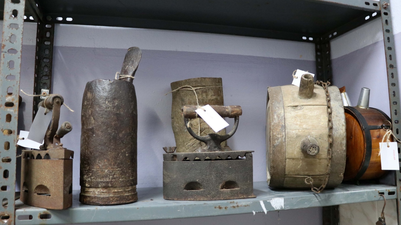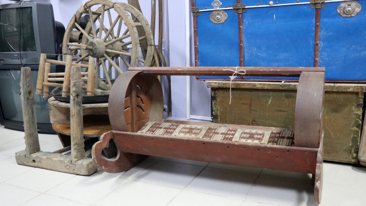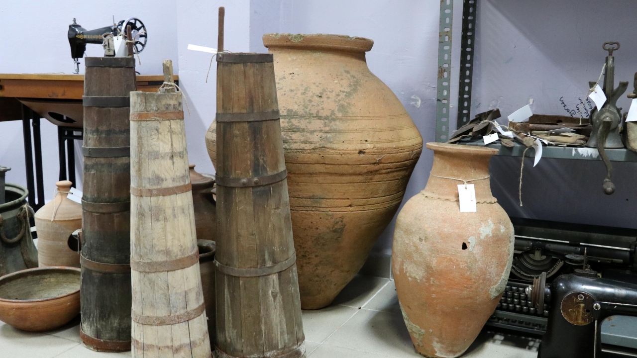 Eşyalar arasında yer alan eski mutfak araçları, su küpleri, patlamış top mermisinden yapılmış havan, el yazması notlar bulunan Kur`an-ı Kerim, yağlı güreşlerde giyilen kispet, müzik aletleri ve daktilolar dikkat çekiyor.
