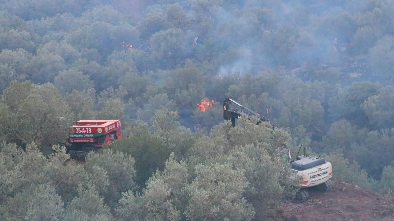 İzmir`in Dikili ilçesinde otluk alanda çıkan ve zeytinlik alana sıçrayan yangına karadan ve havadan müdahale sürüyor. Havanın aydınlanmasıyla birlikte 2 uçak ve 2 helikopterle yangın söndürme çalışmalarına destek verilmeye başlandı.