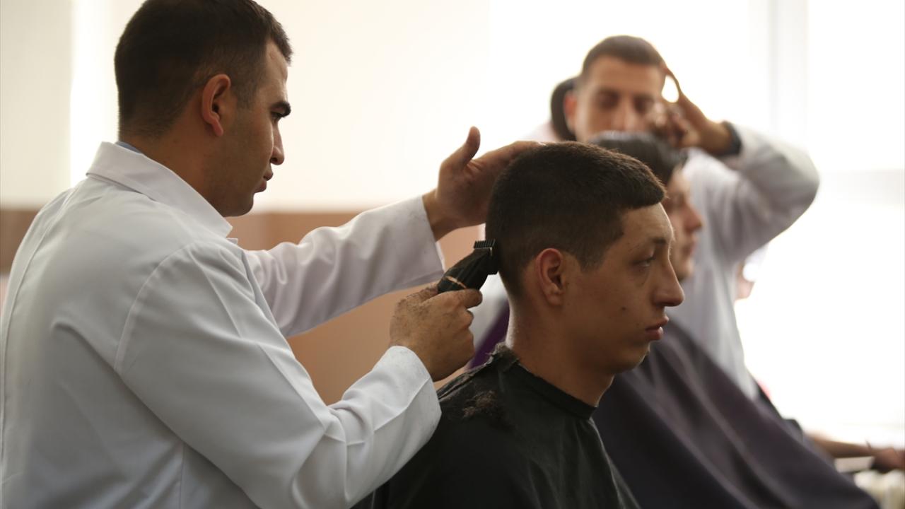 Çanakkale Boğaz ve Garnizon Komutanlığı`na aileleriyle gelen 12 engelli genç, saç tıraşı olup üniformalarını giymelerinin ardından eğitim alanına çıktı.