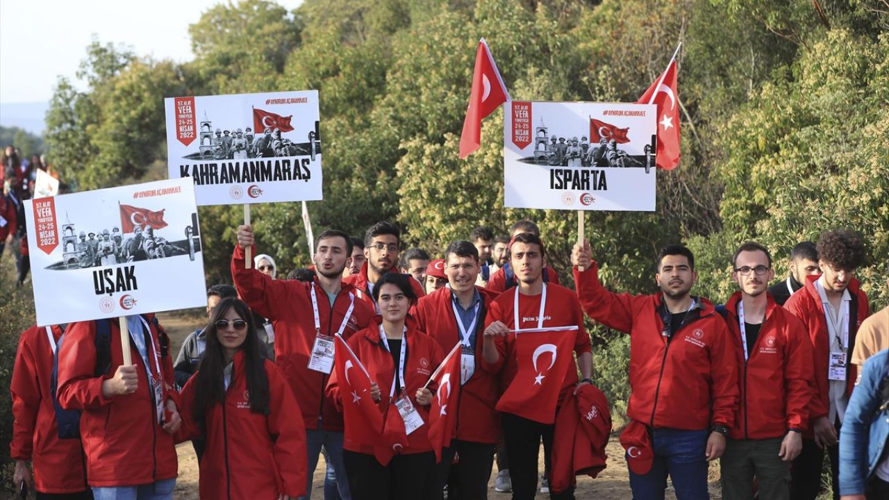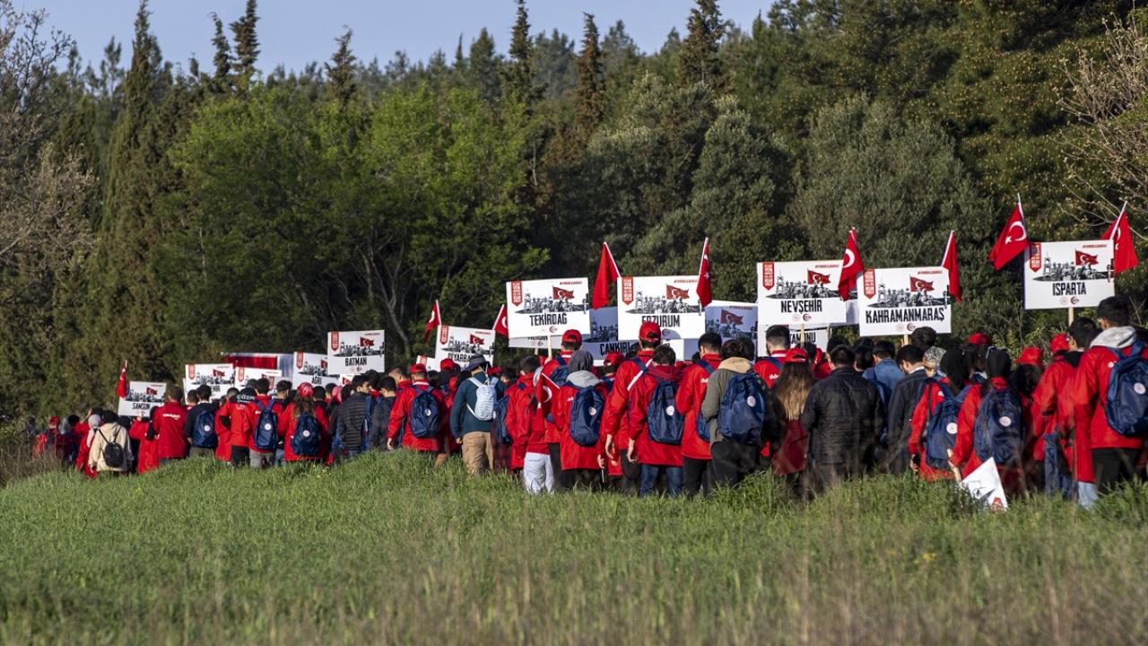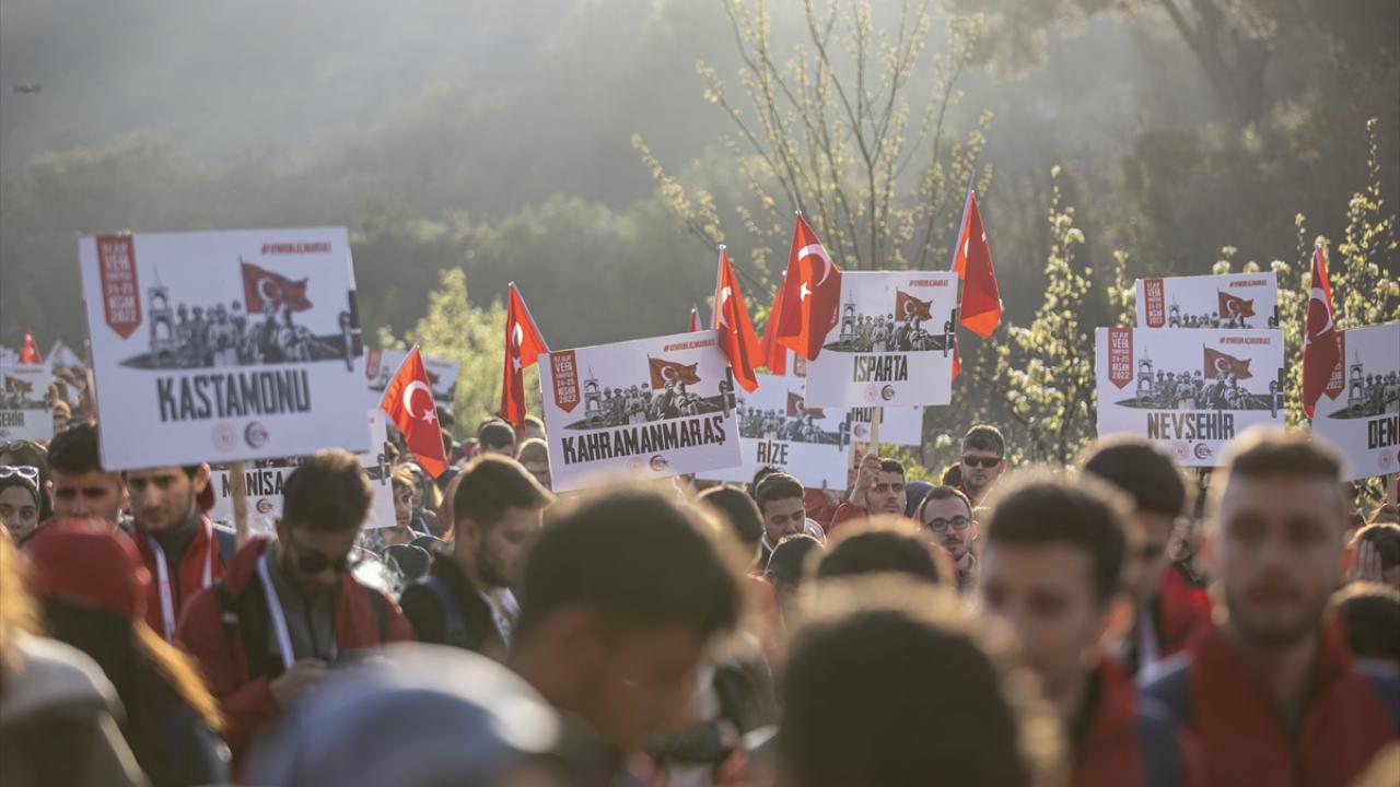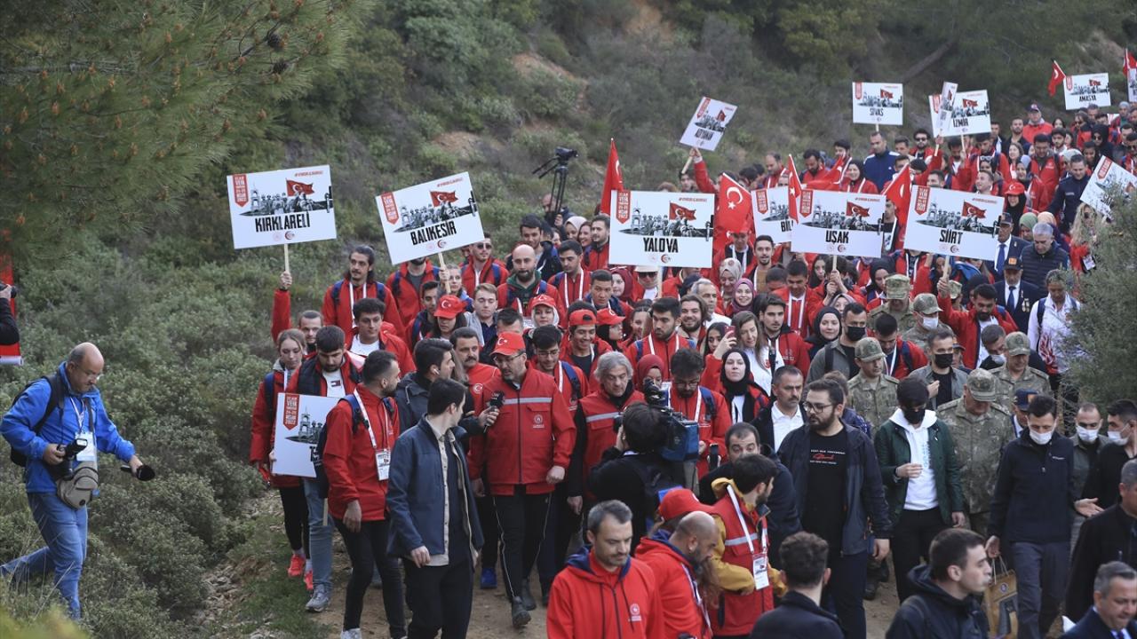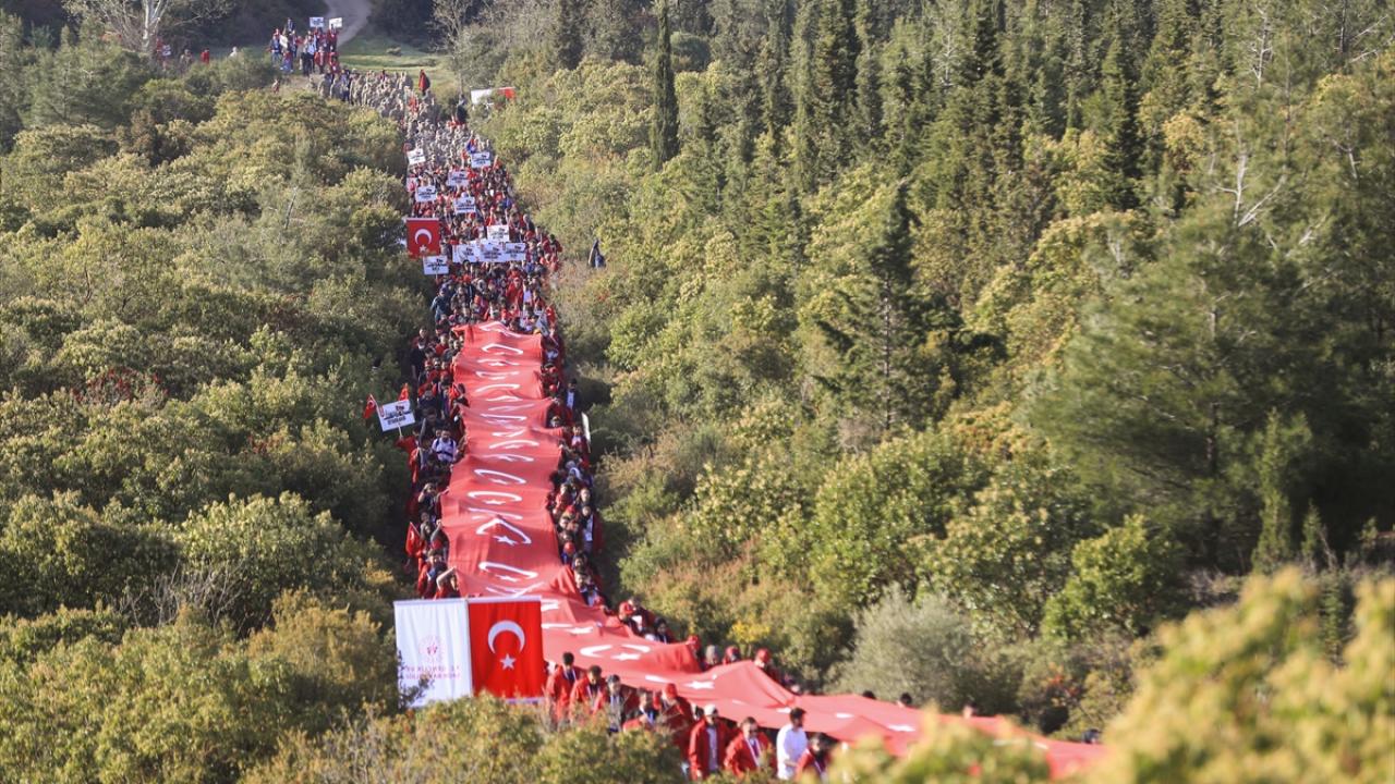 Yürüyüşte Çanakkale Kara Savaşları Zaferi`nin 107. yılına ithafen 107 metrelik Türk bayrağı da açıldı.